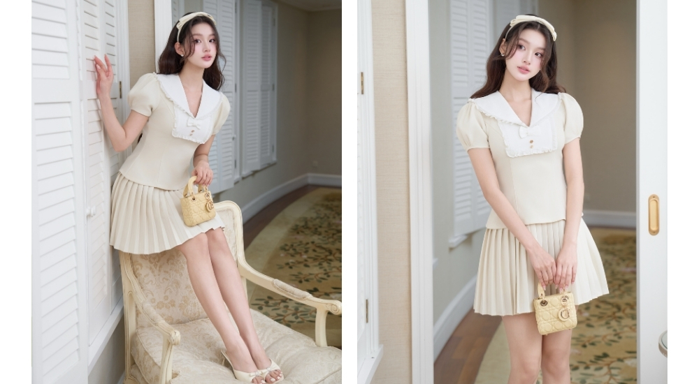 Với chi tiết cổ lá sen, nàng sẽ thấy mình trở nên trong trẻo, gần gũi nhưng không kém phần thanh lịch – đúng tinh thần “Korean muse” mà nhiều người hướng đến.