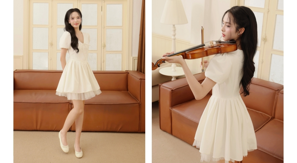 Nếu nàng yêu thích sự duyên dáng xen lẫn nét cá tính, váy xếp ly chính là lựa chọn hoàn hảo. Những đường gấp nếp đều đặn vừa tạo hiệu ứng thị giác thon gọn, vừa gợi liên tưởng đến vẻ đẹp cổ điển của thập niên trước.