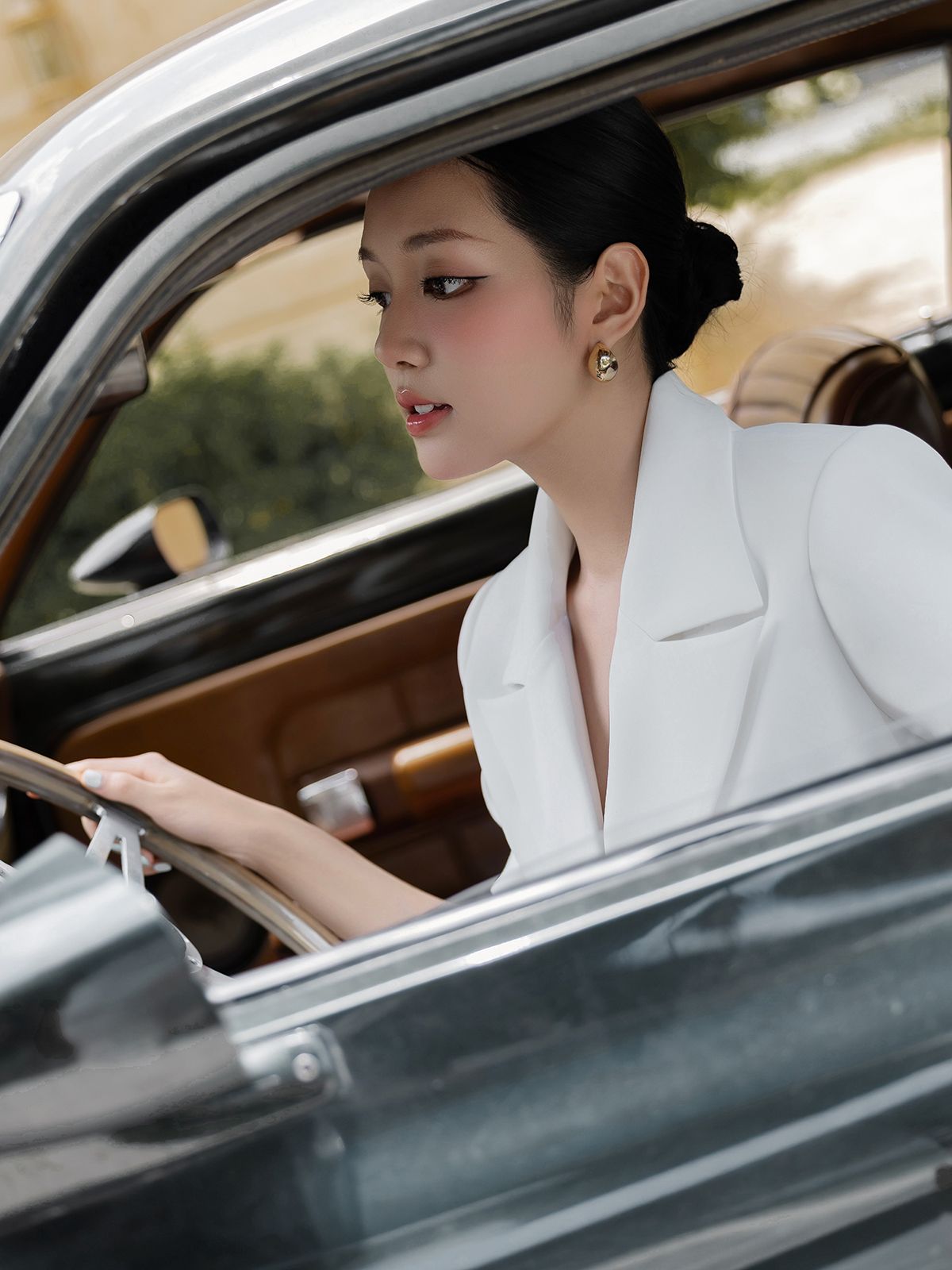 🔹 Chiếc áo được thiết kế theo form vest rộng vừa, tay ngắn, tạo cảm giác thoải mái nhưng vẫn giữ nét chỉn chu. Đường chít eo được xử lý khéo léo, giúp tạo độ gãy eo tự nhiên, tôn lên vòng 2 và vòng 3 đầy quyến rũ. Phần thân trước được thiết kế với túi mổ và nắp túi thật, vừa tiện dụng vừa tăng tính thẩm mỹ. Dạng áo 2 hàng khuy, đi kèm nút kim loại cao cấp không gỉ, mang lại cảm giác sang trọng và tinh tế.