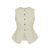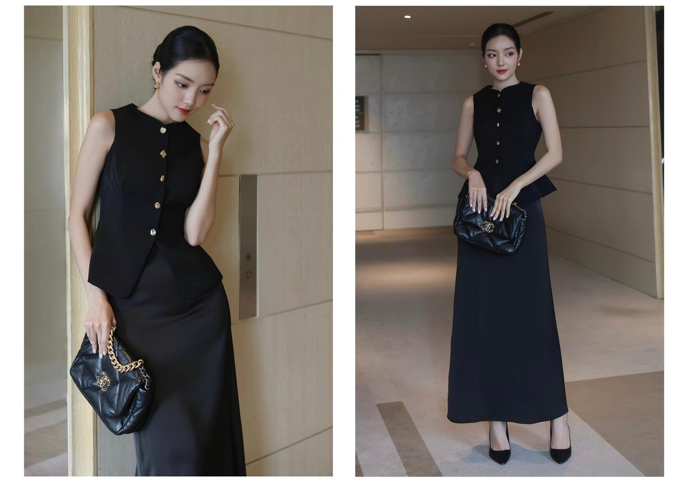 🔹 Form peplum ôm eo và xòe nhẹ ở phần hông tạo hiệu ứng vóc dáng thon gọn, nữ tính mà vẫn sang trọng. Vạt áo bầu mềm mại, kết hợp cùng hàng nút kim loại cao cấp tạo điểm nhấn sang trọng cho tổng thể.