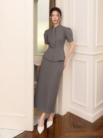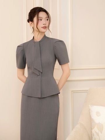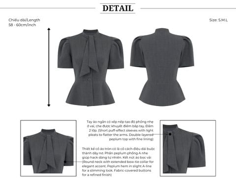 🔹 Form dáng áo peplum tay ngắn cổ tròn được xử lý khéo léo với phần peplum phồng A nhẹ, giúp tạo hiệu ứng vòng eo nhỏ gọn và hack dáng tự nhiên. Điểm nhấn nổi bật chính là chi tiết lá cổ dài buộc thành dây nơ duyên dáng, vừa mang lại sự tinh tế, vừa tạo nét đặc biệt khó lẫn. Phần tay áo ngắn có xếp nếp nhẹ ở vai giúp che đi khuyết điểm bắp tay, đồng thời tạo nên sự cân đối và thanh thoát cho tổng thể trang phục.