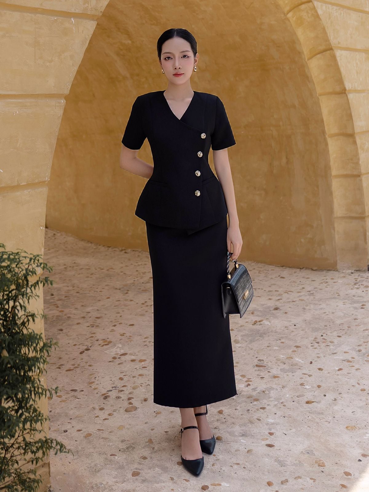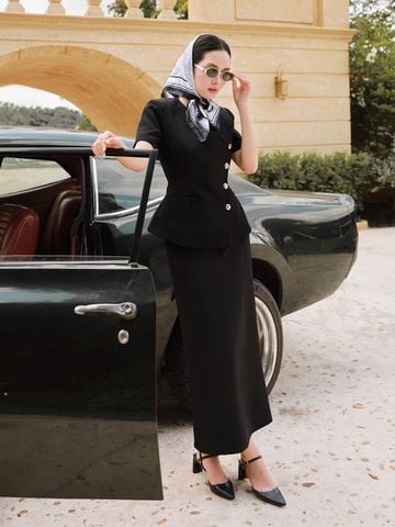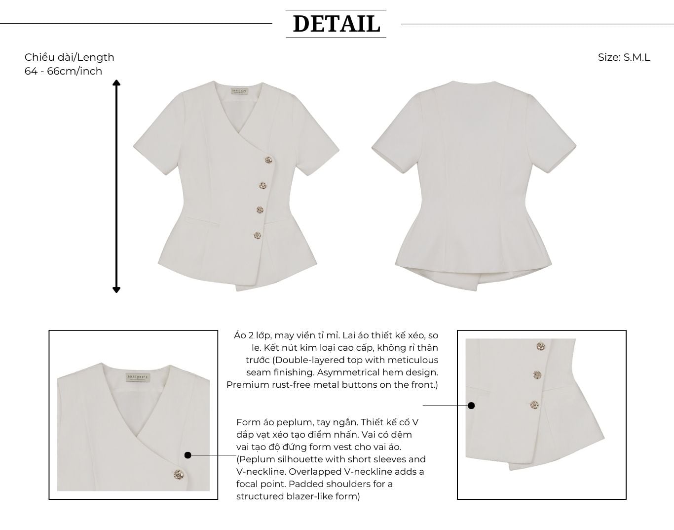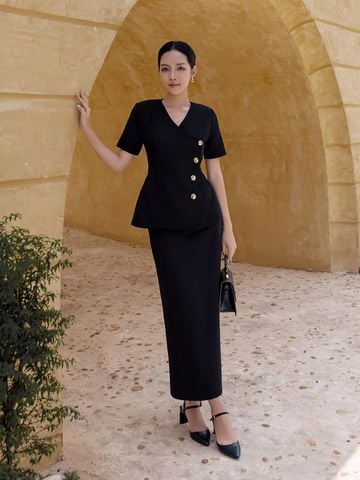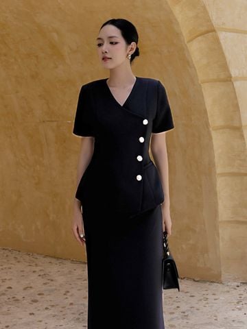 🔹 Chiếc áo được thiết kế theo form peplum tay ngắn cổ V, với phần cổ đắp vạt xéo độc đáo, tạo điểm nhấn mới lạ và cuốn hút. Đường lai cắt xéo, so le làm tăng sự khác biệt, giúp tổng thể thêm phần hiện đại. Đường chít eo tinh tế tôn lên vòng 2 và vòng 3, mang lại sự cân đối cho vóc dáng. Vai áo được bổ sung đệm vai nhẹ, tạo form đứng dáng vest quyền lực, trong khi hàng khuy kim loại cao cấp không gỉ ở thân trước vừa bền đẹp vừa nâng tầm đẳng cấp.