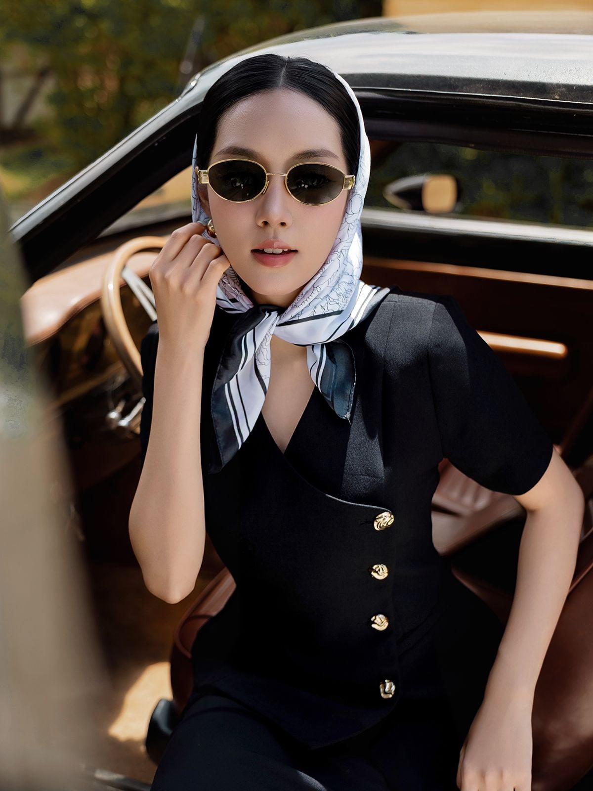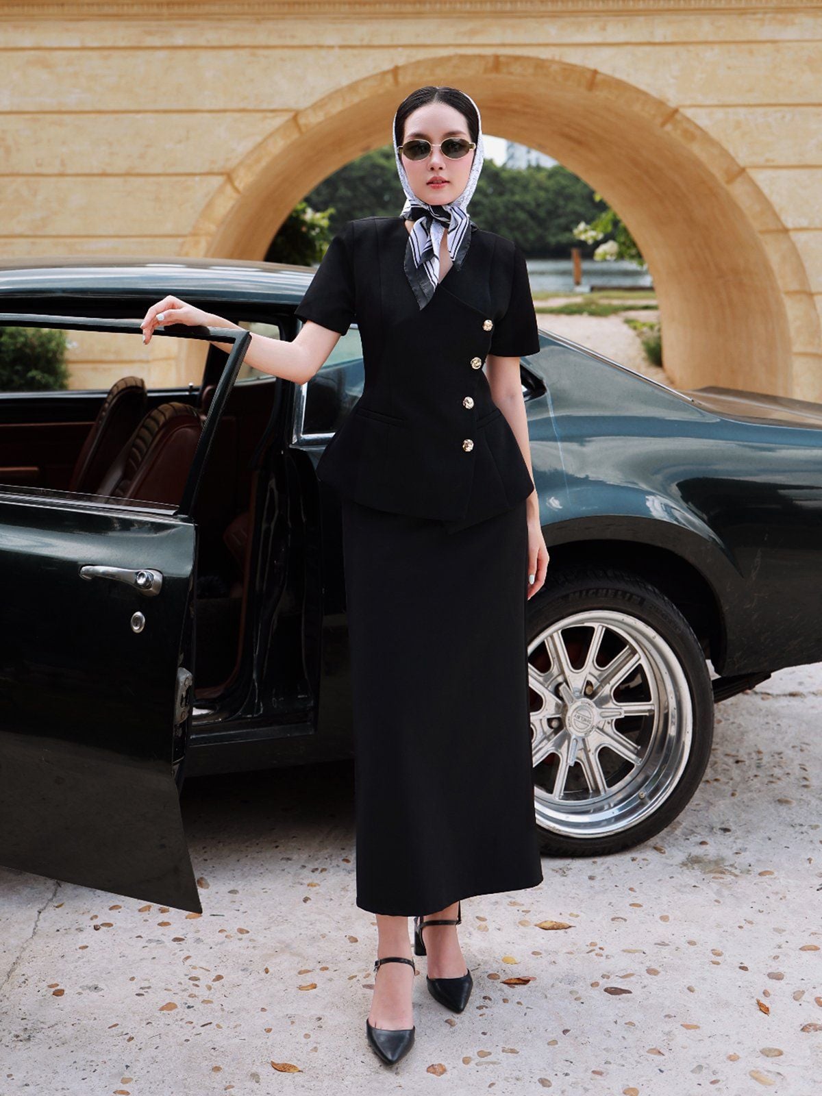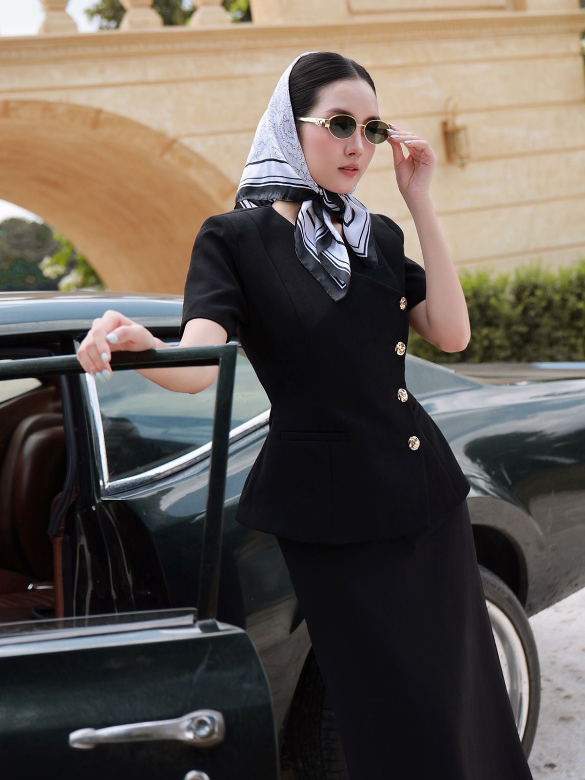 🔹 Chiếc áo được thiết kế theo form peplum tay ngắn cổ V, với phần cổ đắp vạt xéo độc đáo, tạo điểm nhấn mới lạ và cuốn hút. Đường lai cắt xéo, so le làm tăng sự khác biệt, giúp tổng thể thêm phần hiện đại. Đường chít eo tinh tế tôn lên vòng 2 và vòng 3, mang lại sự cân đối cho vóc dáng. Vai áo được bổ sung đệm vai nhẹ, tạo form đứng dáng vest quyền lực, trong khi hàng khuy kim loại cao cấp không gỉ ở thân trước vừa bền đẹp vừa nâng tầm đẳng cấp.