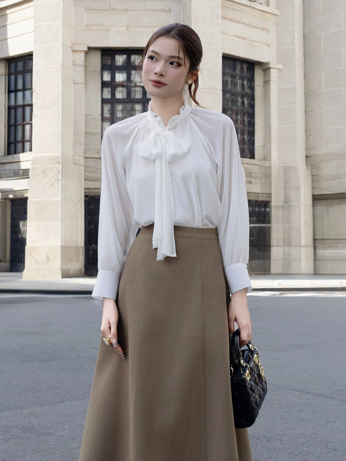 🔹 Nàng hãy phối theo phong cách classic office với quần suông lưng cao hoặc chân váy bút chì, thêm đồng hồ và khuyên tai nhỏ để tổng thể thật sang. Nàng cũng có thể phối theo phong cách Parisian chic với chân váy midi, túi da form cứng và giày mũi nhọn để bước đi thật có khí chất.