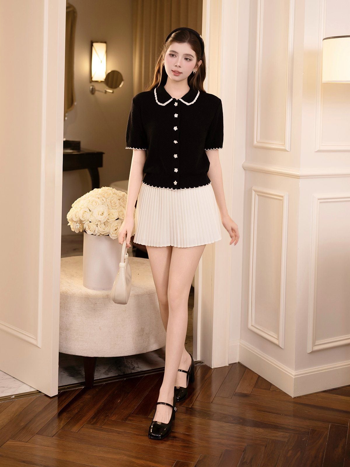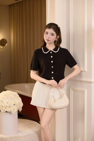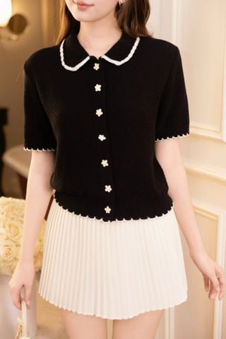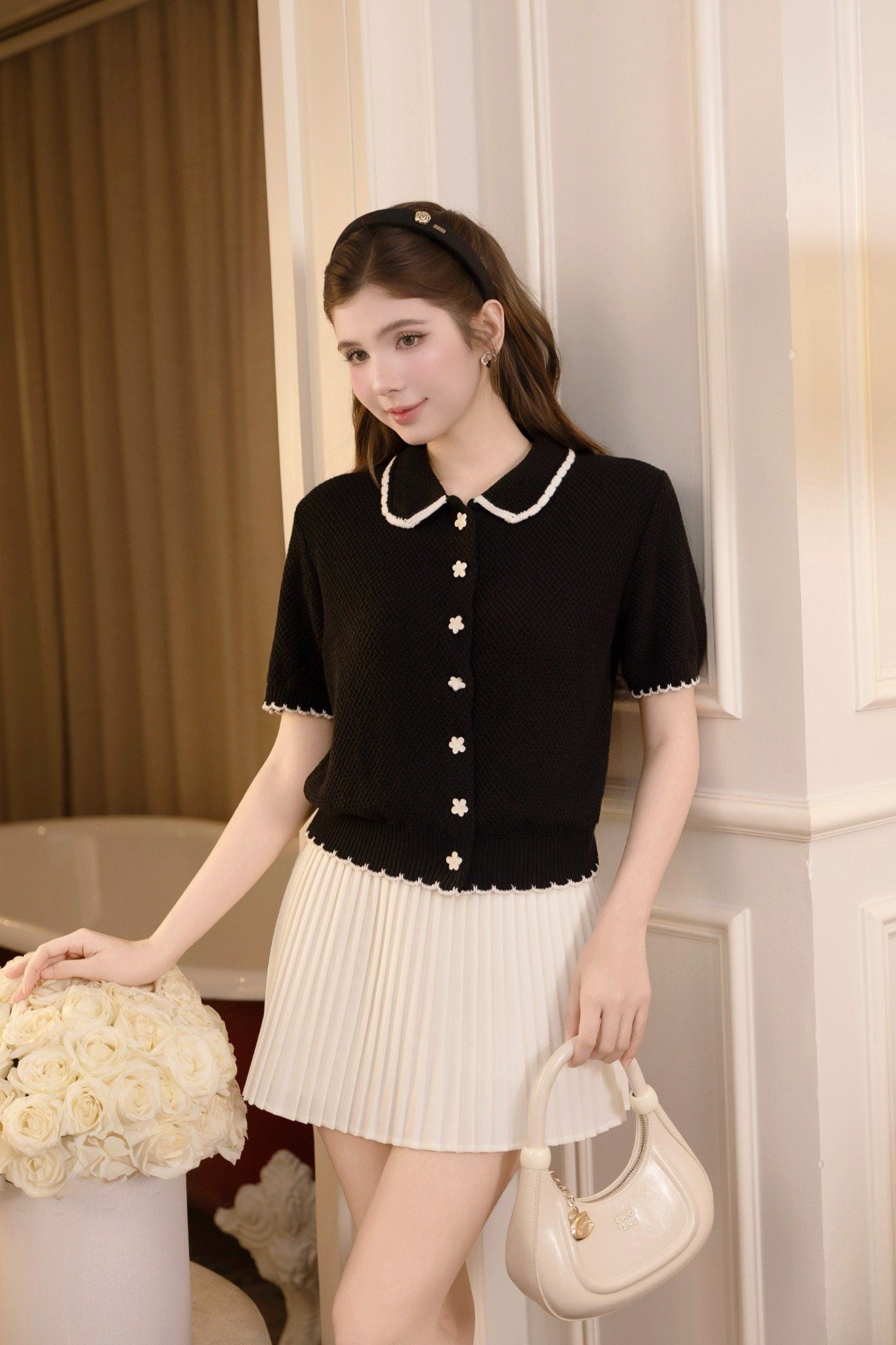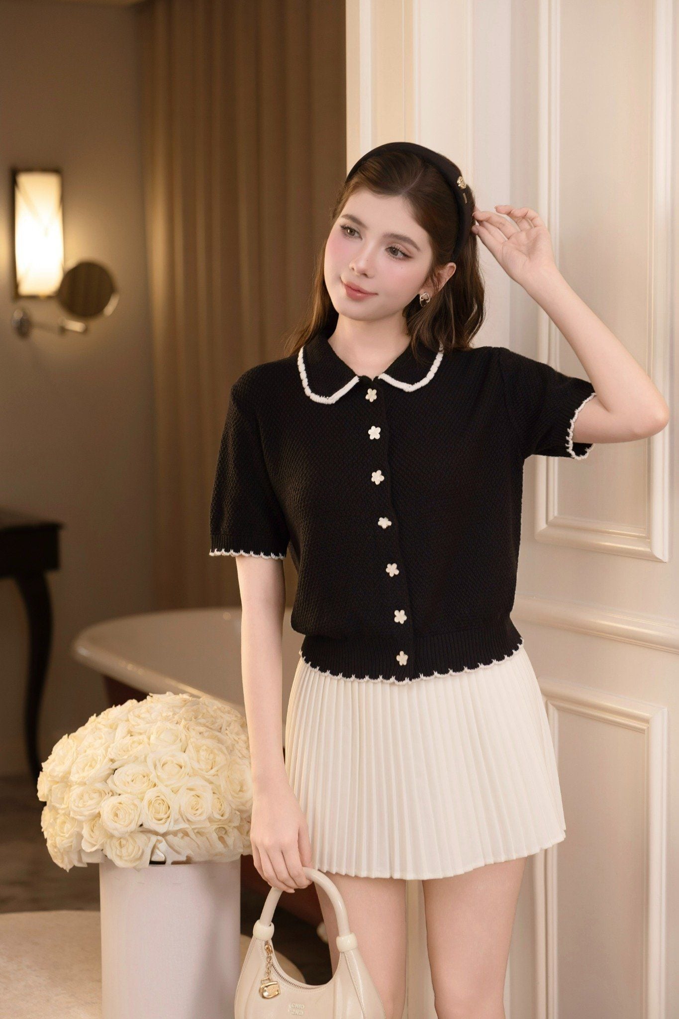 🔹 Form áo tay ngắn, cổ sen viền tương phản, được thiết kế vừa vặn, dễ mặc và tôn dáng. Điểm nhấn nằm ở hàng nút hoa kim loại cao cấp và viền dệt tỉ mỉ quanh cổ, tay áo, lai áo – tạo nên tổng thể tinh tế và sang trọng. Chất liệu len dệt kim cao cấp mang lại cảm giác mềm mịn, thoáng nhẹ, không gây bí dù mặc suốt ngày dài.