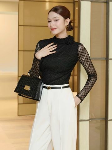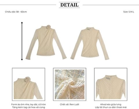 🔹 Với form áo ôm nhẹ, tay dài và cổ tròn cơ bản, sản phẩm tôn dáng một cách tự nhiên, đồng thời dễ phối cùng nhiều kiểu quần váy khác nhau. Thiết kế lưới cotton độc đáo cùng kỹ thuật xếp vải ở vai khéo léo tạo điểm nhấn, kết hợp với tag cài hoa vải tặng kèm – mang lại cảm giác vừa cổ điển, vừa mới mẻ. Dù là màu kem nhẹ nhàng hay đen cá tính, nàng đều dễ dàng thể hiện cá tính riêng qua từng gam sắc.