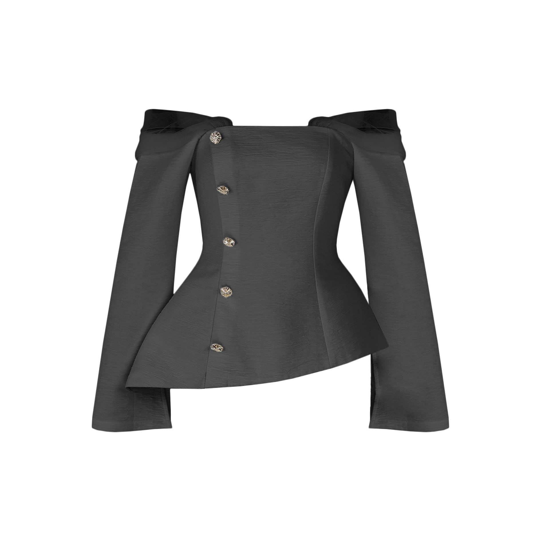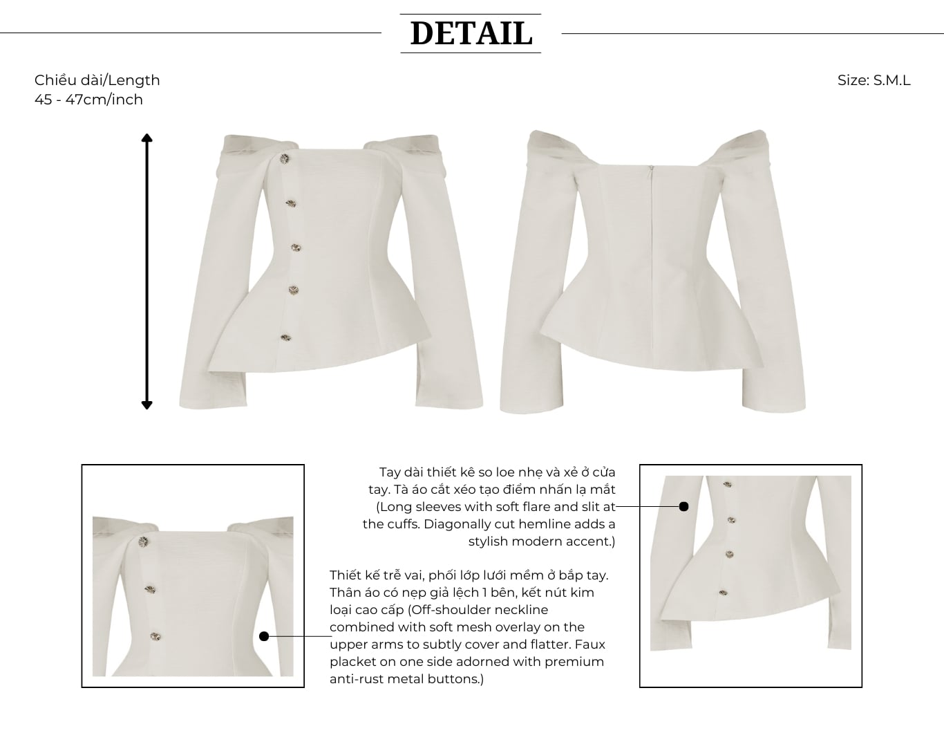 🔹 Form áo peplum phồng nhẹ kết hợp dáng trễ vai tay dài ôm vừa vặn, tạo hiệu ứng tôn vòng eo và giúp bờ vai – xương quai xanh trở nên cuốn hút hơn. Phần thân áo có nẹp giả lệch 1 bên, kết nút kim loại cao cấp không gỉ, đi cùng tà áo cắt xéo lạ mắt, khiến tổng thể trở thành điểm nhấn hoàn hảo cho các set áo tiệc, áo đi tiệc hay áo dự tiệc. Lớp lưới mềm ở bắp tay giúp che khuyết điểm, cho nàng thêm tự tin.