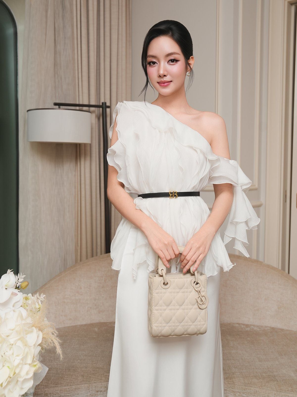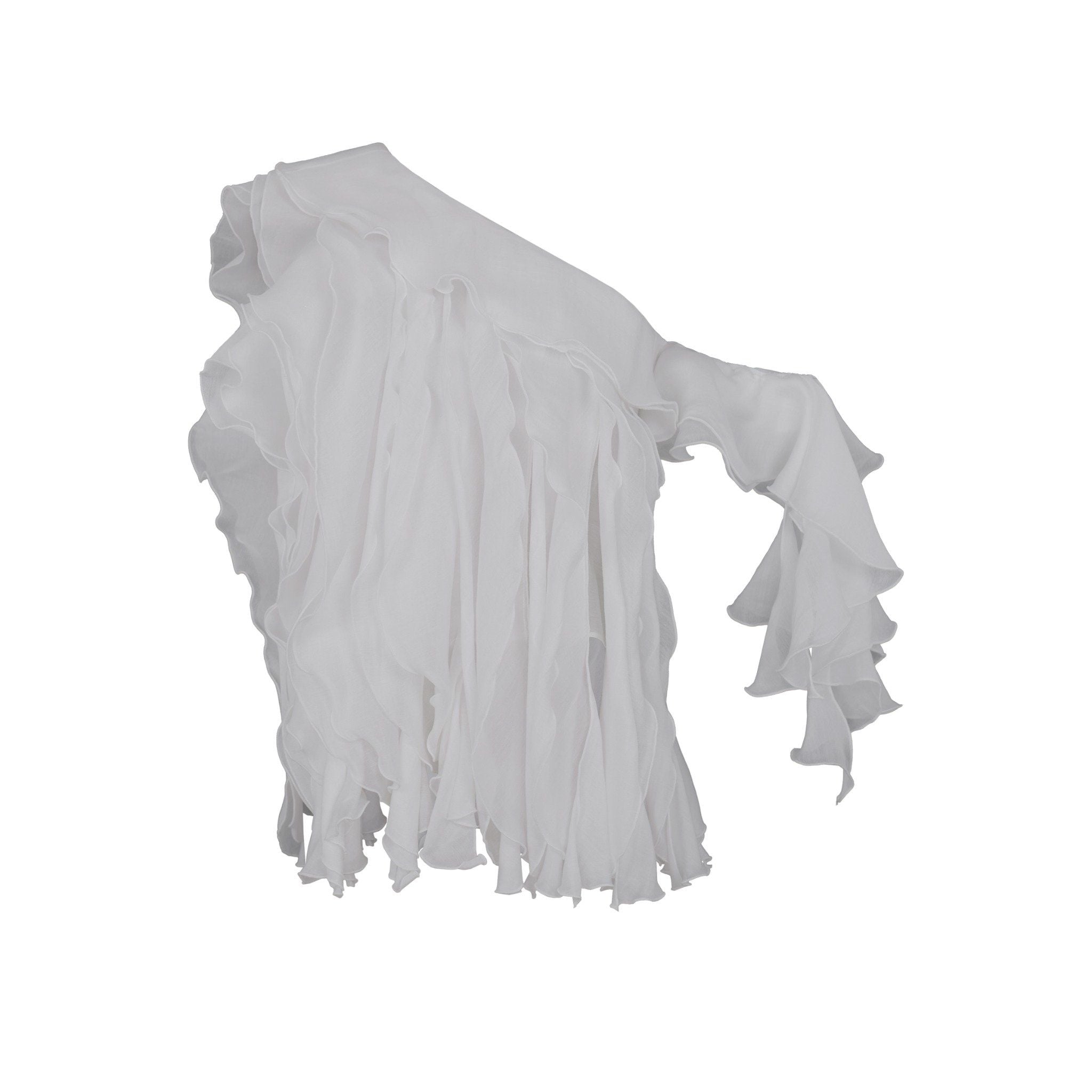 🔹 Form áo voan trễ vai được xử lý khéo léo với phần cổ xéo lệch vai, giúp khoe trọn bờ vai thanh mảnh và tạo điểm nhấn quyến rũ vừa đủ. Thân áo nổi bật với nhiều tầng bèo xếp bất đối xứng, từng lớp vải được cắt xoắn và se viền tỉ mỉ, mang lại độ bay bổng và sống động khi nàng di chuyển.
