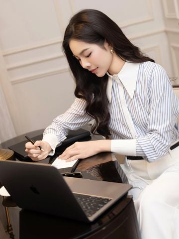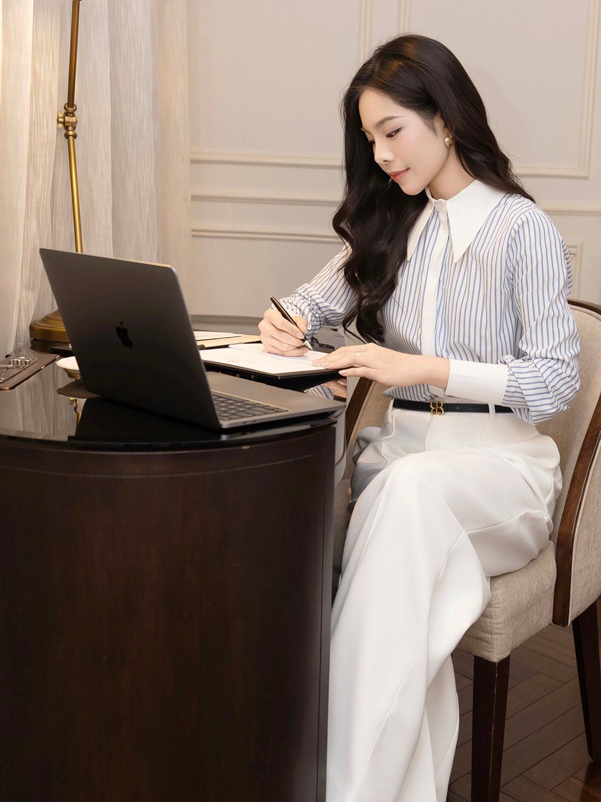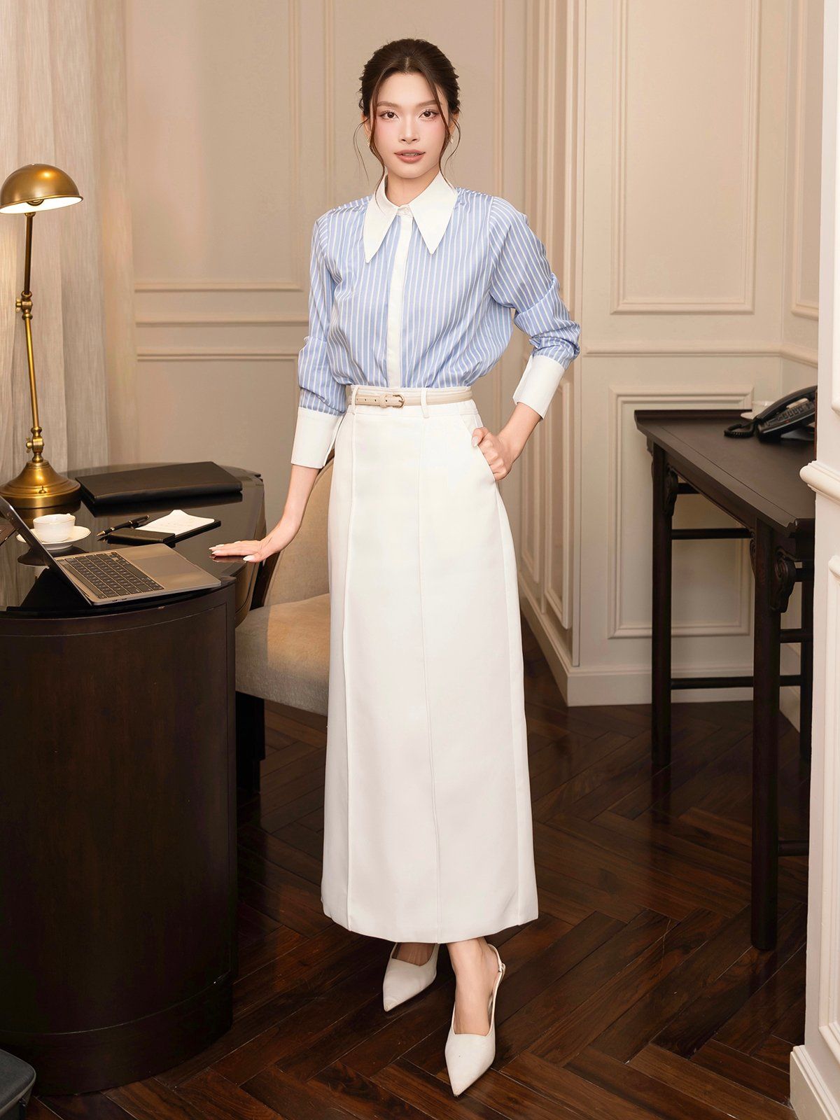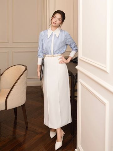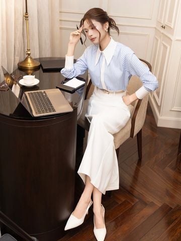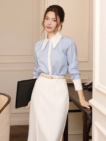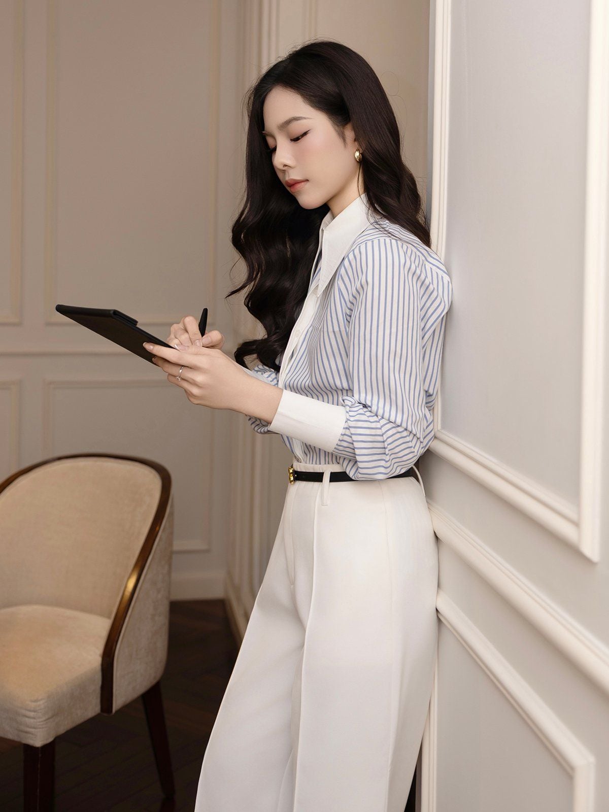 🔹 Phom áo công sở rộng vừa tôn dáng, áo sơ mi tay dài với lá cổ nhọn sắc sảo tạo khung cổ thanh thoát. Thiết kế phối lá cổ và nẹp giữa thân bằng vải trắng, măng sét tay đồng điệu giúp tổng thể sáng gương mặt, tạo điểm nhấn tinh tế trên nền áo sơ mi sọc. Nẹp đôi giấu nút khiến bề mặt phẳng phiu, hạn chế nhăn nhúm khi cử động.