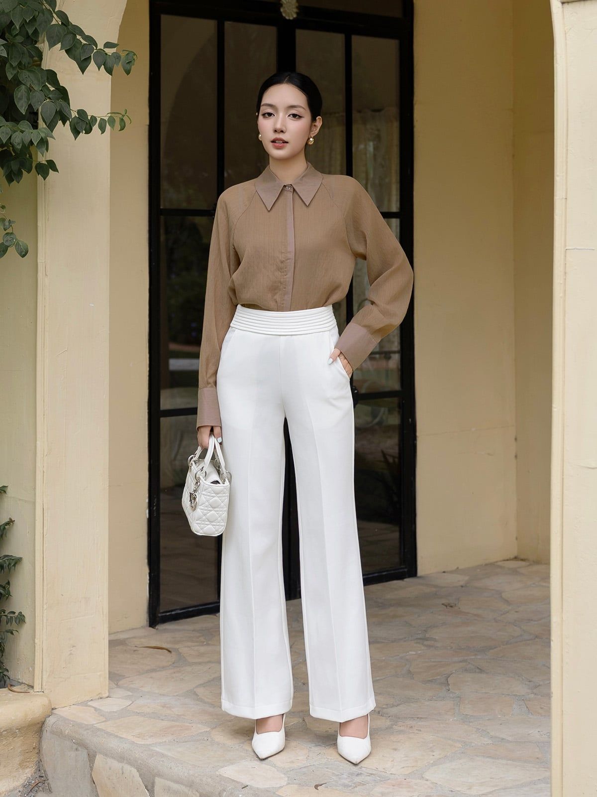 🔹 Nàng có thể phối áo cùng quần tây ống suông để tạo nên set đồ thanh lịch, chỉn chu cho công sở. Hoặc kết hợp với chân váy midi cùng giày cao gót để mang đến phong cách nữ tính, sang trọng hơn.