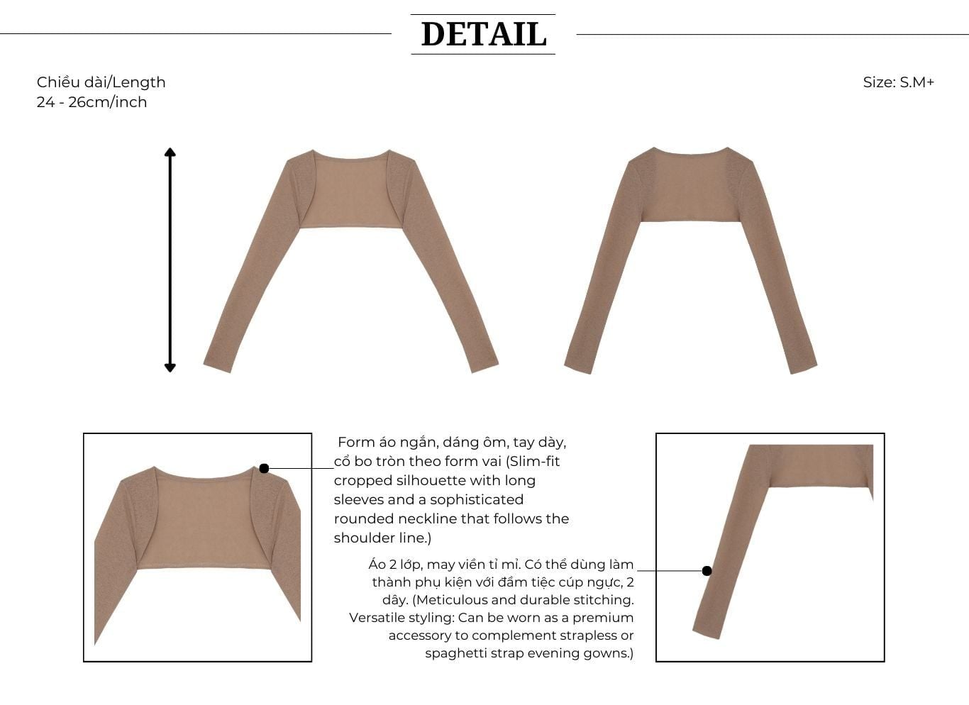 🔹 Sản phẩm là áo tiệc kết hợp chất áo thun mềm mịn với phom áo dáng ngắn ôm gọn. Form áo ngắn được xử lý khéo léo để tạo hiệu ứng tỷ lệ cơ thể cân đối, giúp vòng eo trông thon hơn khi phối cùng các item cạp cao. Áo phom ngắn/áo form ngắn có tay dài dày dặn, ôm vừa vặn, vì vậy nàng có thể che nhẹ phần bắp tay và giữ nét thanh thoát cho phần thân trên. Cổ áo bo tròn theo form vai tạo cảm giác tinh tế, cổ điển vừa đủ, đồng thời giúp tổng thể trông mềm mại và sang hơn trong ánh đèn tiệc.