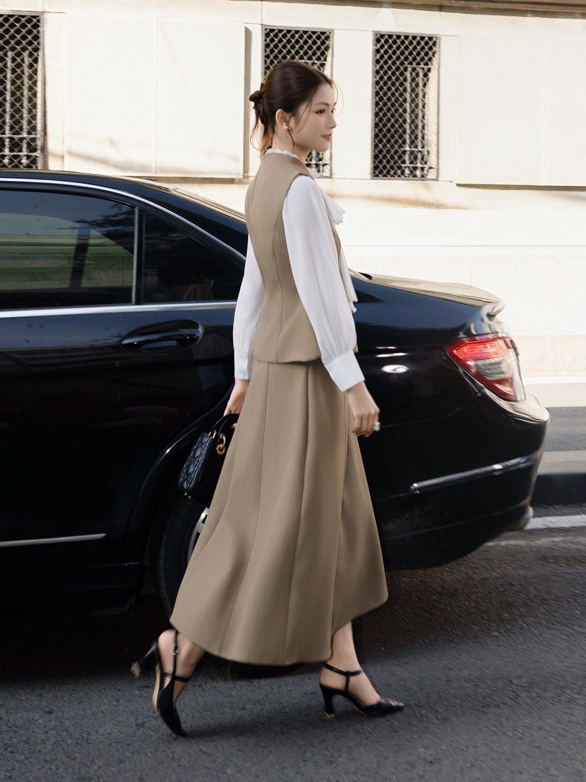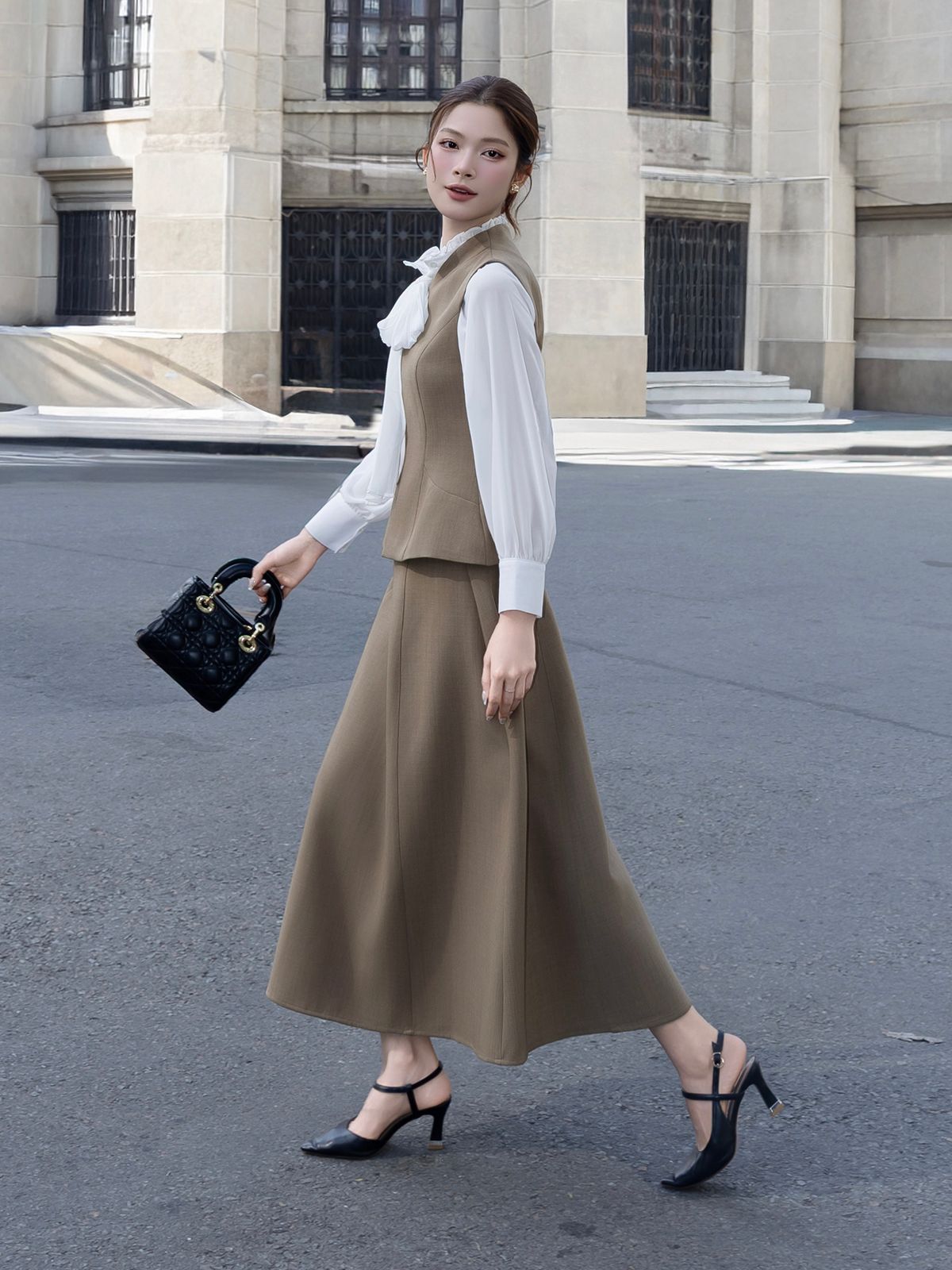 🔹 Nàng có thể phối theo style công sở thanh lịch với áo sơ mi cổ đứng hoặc áo kiểu nữ công sở và giày mũi nhọn. Nàng cũng có thể phối theo style classic hiện đại với áo gile, túi da nhỏ và khuyên tai tối giản để tổng thể sang mà không gắng gượng.