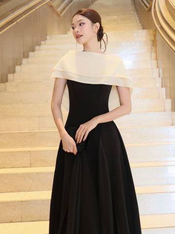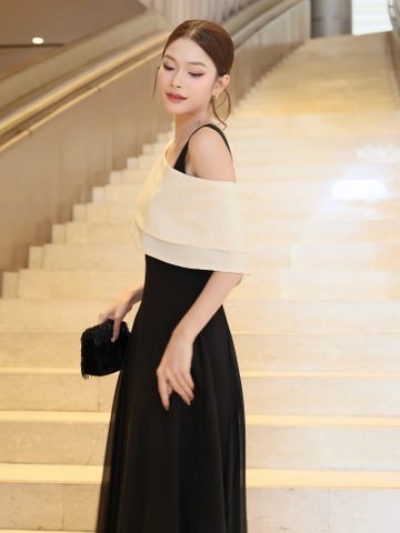 🔹 Thiết kế: Form đầm chữ A xòe, không tay, tùng váy phối voan tạo hiệu ứng bay, có kèm khăn choàng
