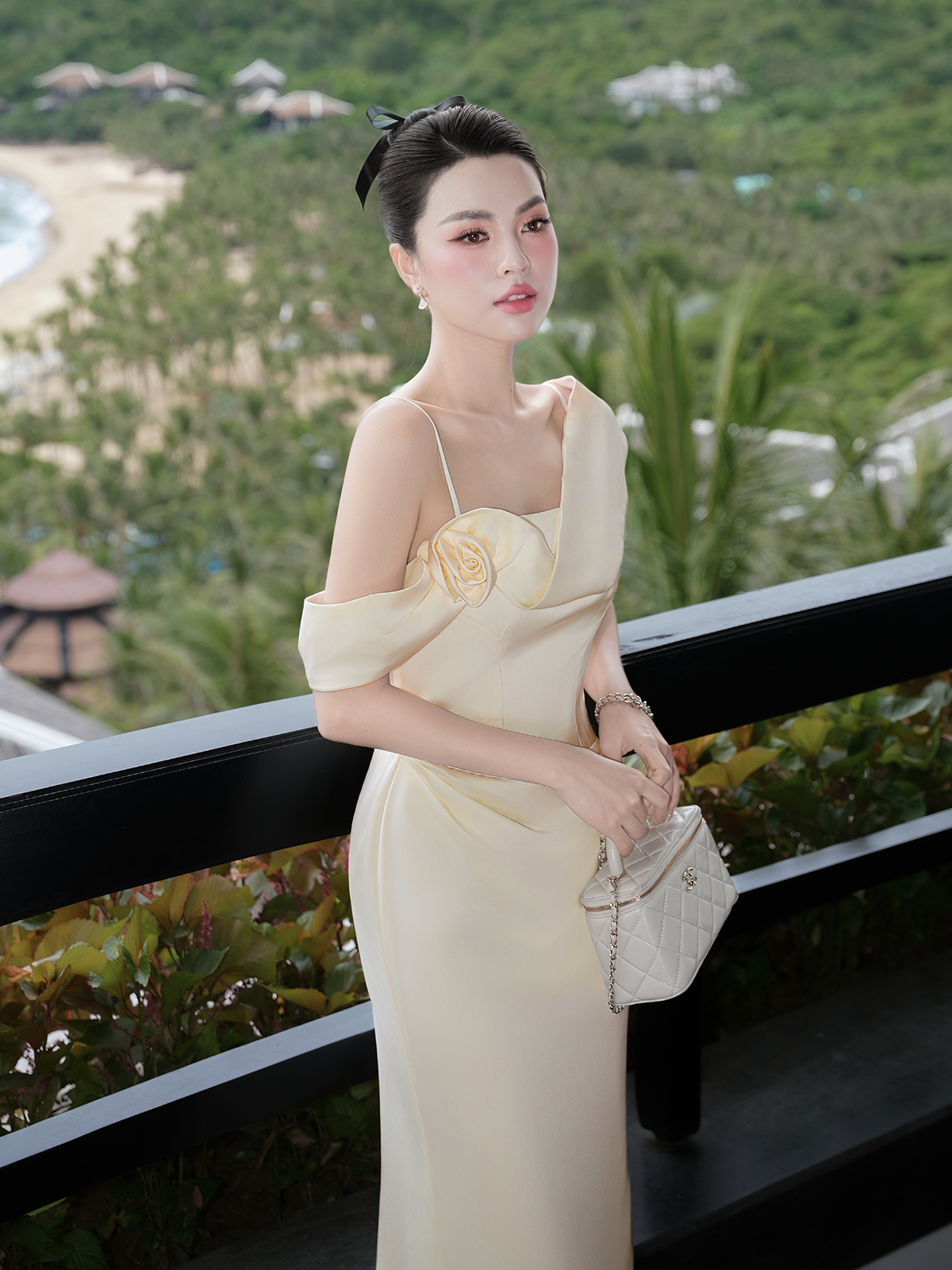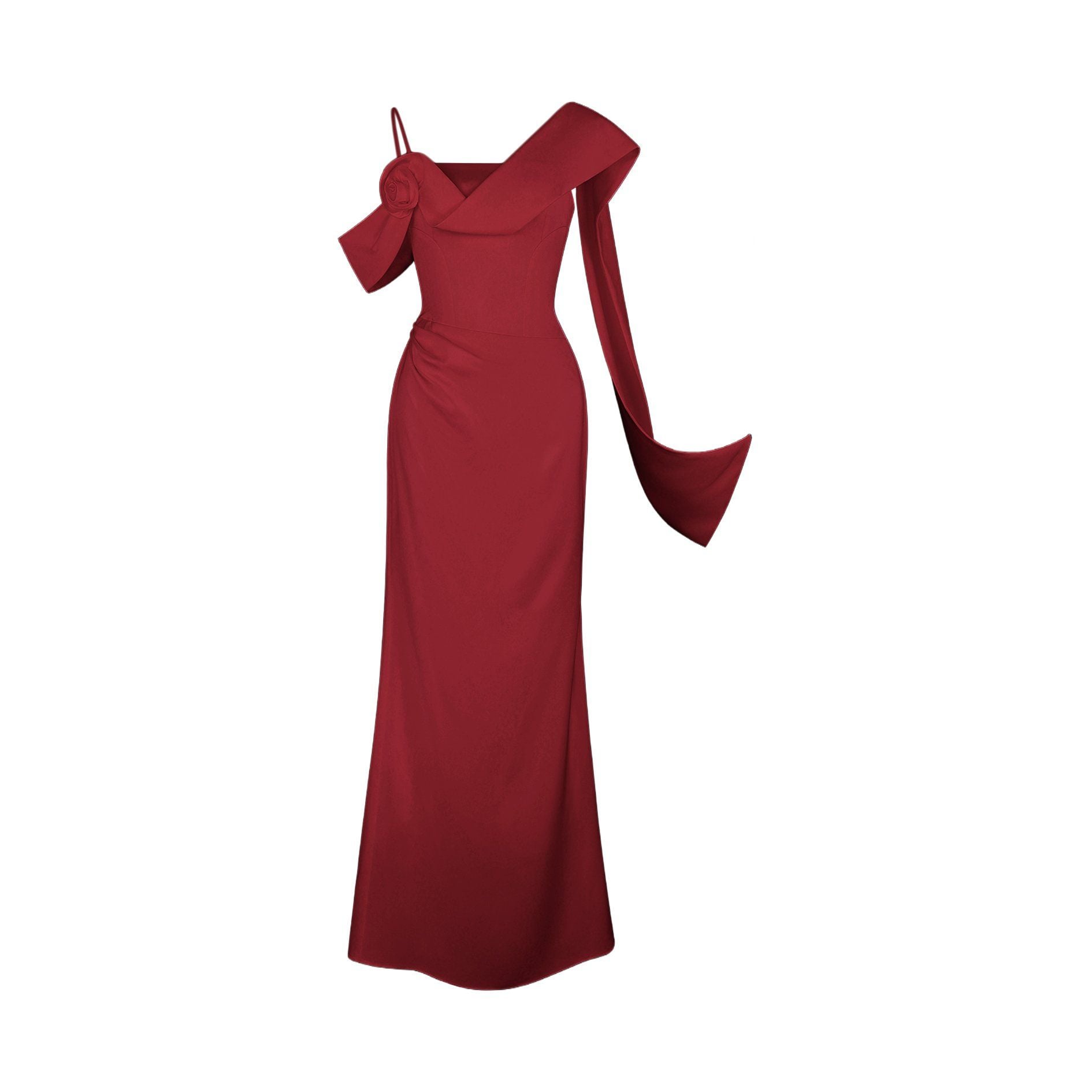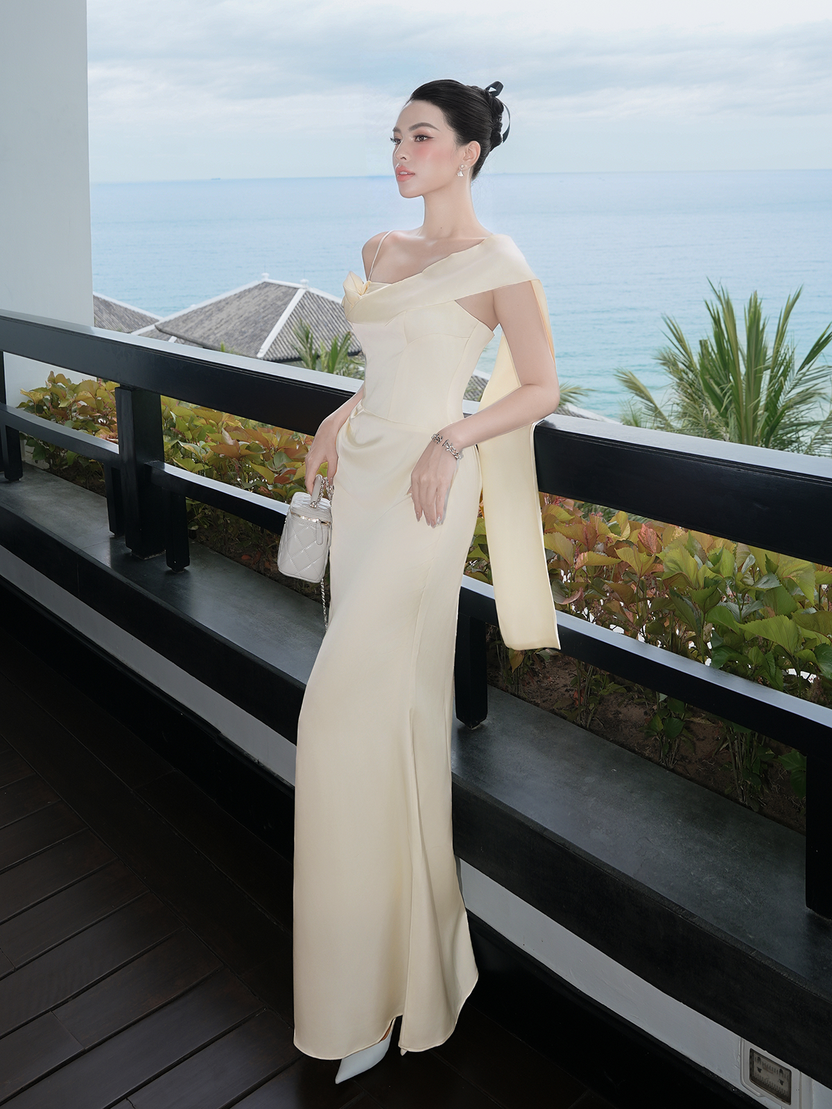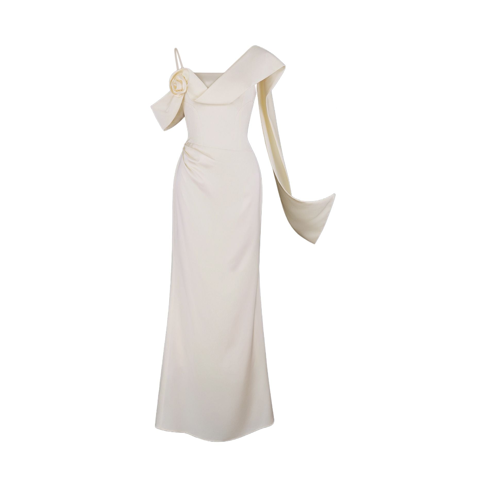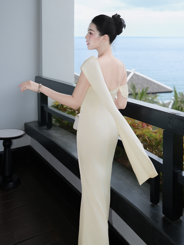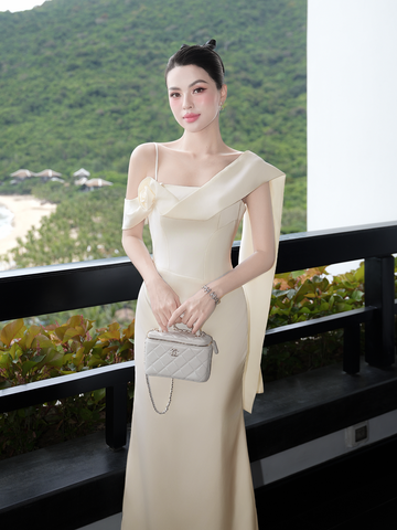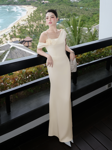 🔹 Form đầm body 2 dây ôm nhẹ đường cong, kết hợp phần đuôi cá duyên dáng giúp bước đi thêm uyển chuyển. Điểm nhấn độc đáo nằm ở tay trễ vai một bên, kết hoa xoắn vải 3D tinh xảo và dải lụa mềm mại buông dài sau lưng, tạo hiệu ứng bay bổng khi di chuyển. Phần thân đầm được rã mảnh khéo léo để tạo hiệu ứng eo nhỏ, cùng những đường xếp vải tinh tế giúp che khuyết điểm bụng dưới một cách nhẹ nhàng.