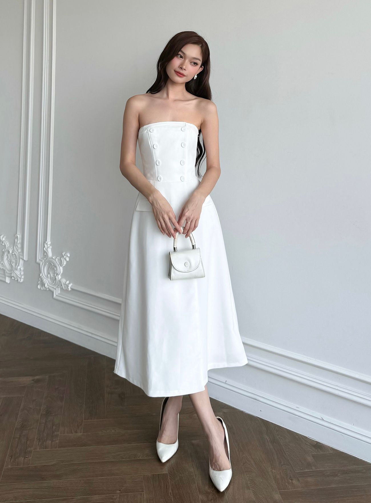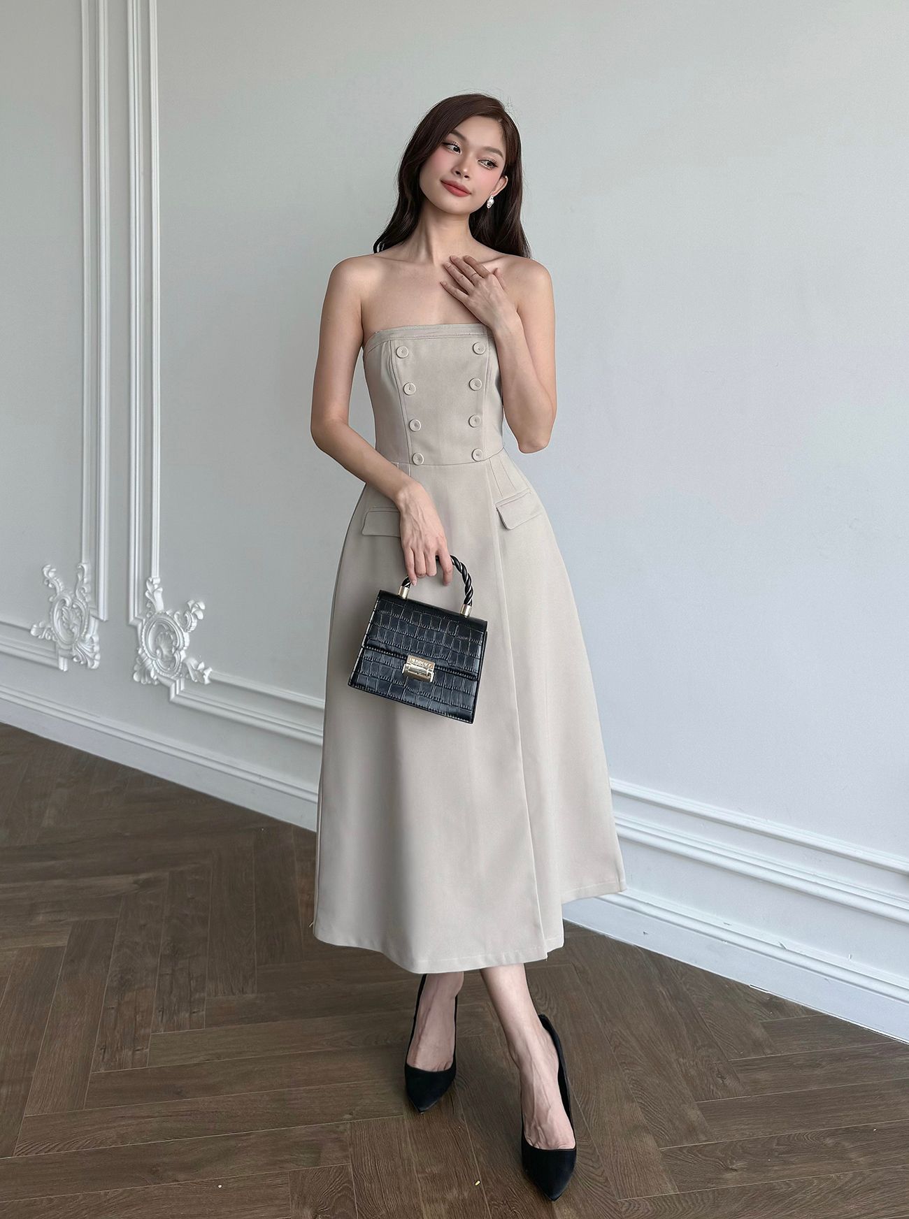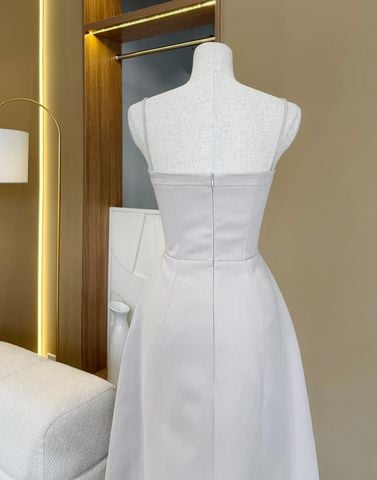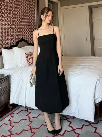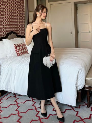 ▪ Tên sản phẩm : Đầm Xòe Hai Dây Dự Tiệc Kết Nút Bọc Phối Túi Nắp Sang Trọng