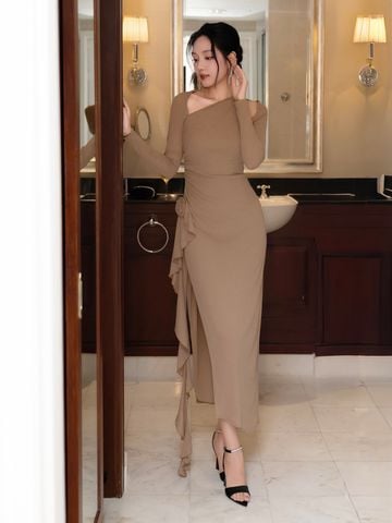 🔹 Đầm D4104T được hoàn thiện với đường may tỉ mỉ, chắc chắn, thể hiện sự chăm chút trong từng chi tiết. Thiết kế tay dài cut-out vai xéo mang đến sự độc đáo, trong khi phần bèo rũ kết hoa vải tạo điểm nhấn mềm mại, tôn lên vẻ nữ tính và duyên dáng. Nàng có thể phối đầm với một đôi giày cao gót và clutch sang trọng để hoàn thiện bộ trang phục.