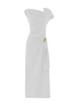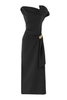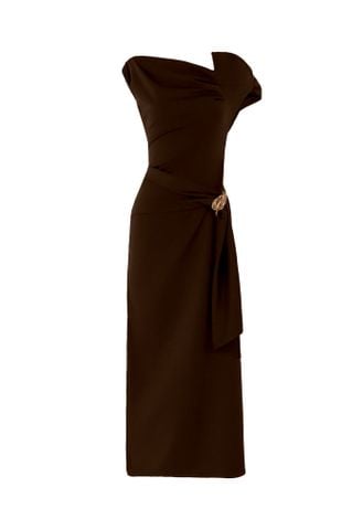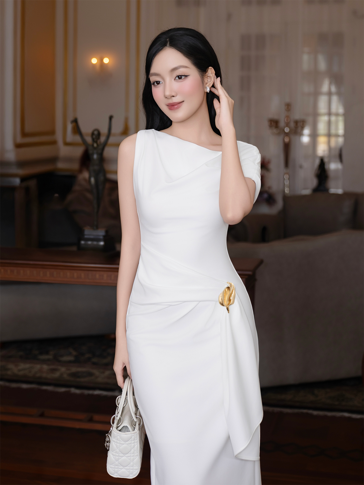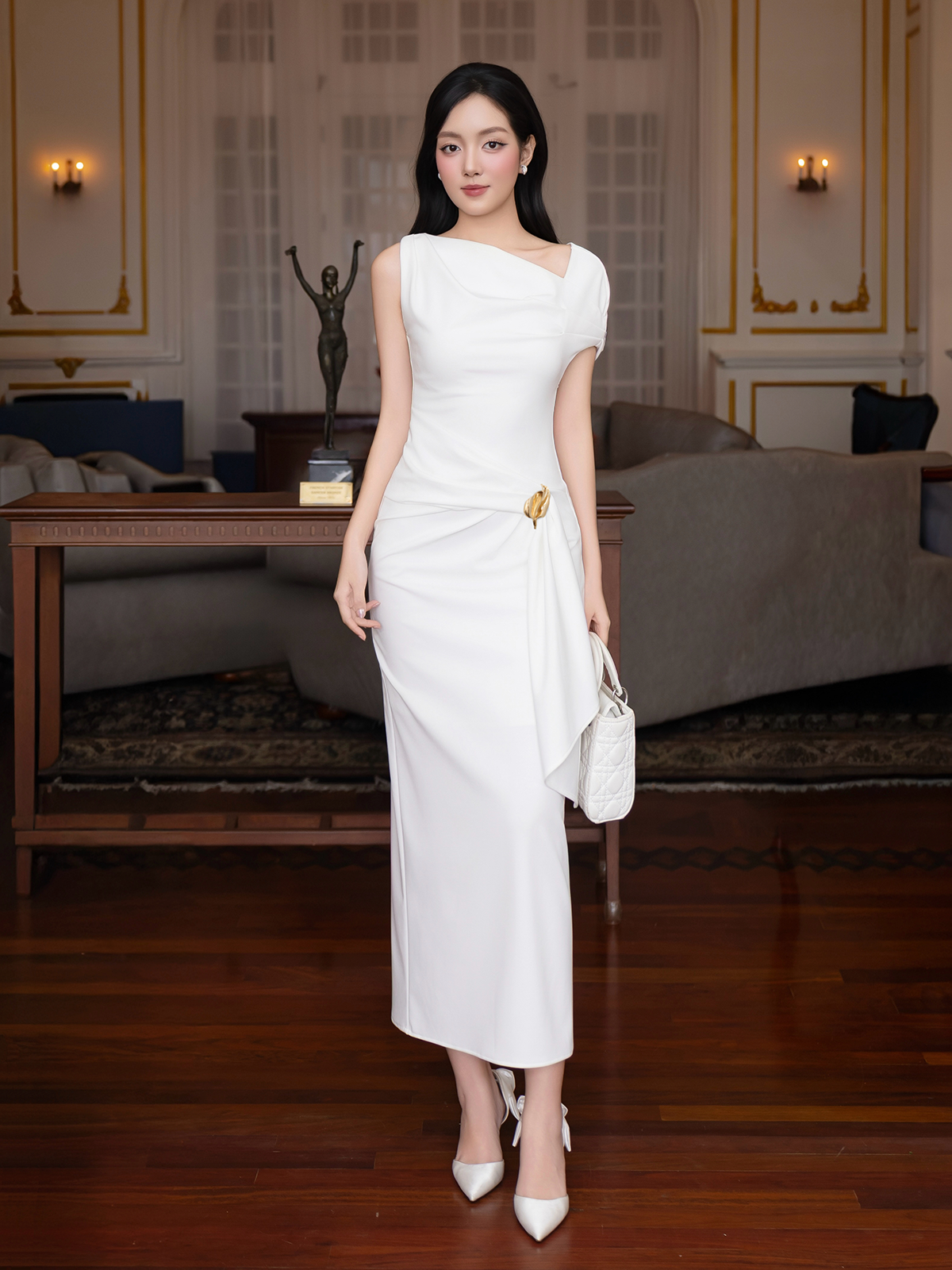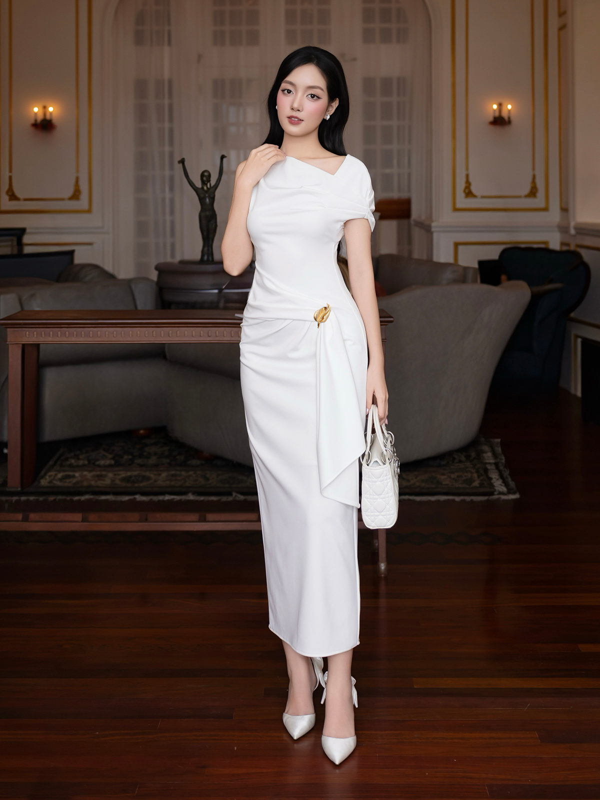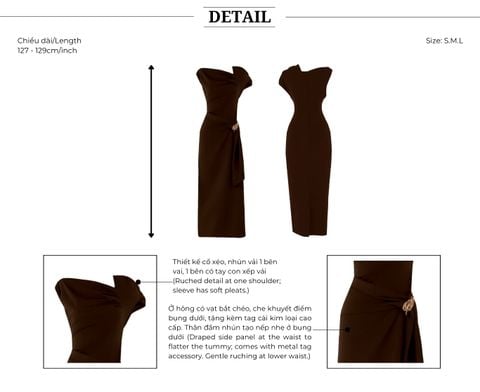 🔹 Form đầm dài dáng đầm suông hơi ôm giúp cơ thể thon gọn một cách khéo léo, đồng thời vẫn giữ sự thoải mái để nàng di chuyển tự nhiên. Phần cổ xéo bất đối xứng tạo cảm giác thanh thoát ở phần vai, trong khi chi tiết nhún vải một bên vai và tay con xếp nếp giúp tổng thể mềm mại, nữ tính hơn. Điểm đắt giá nằm ở vạt bắt chéo nơi hông, vì thiết kế này có khả năng che khuyết điểm bụng dưới rất duyên, và tag cài kim loại đi kèm giúp nàng hoàn thiện vẻ ngoài chỉn chu khi mặc đầm tiệc. Thân đầm có nhún nhẹ ở phần bụng dưới nên nàng luôn thấy vòng eo trông gọn gàng hơn khi soi gương.
