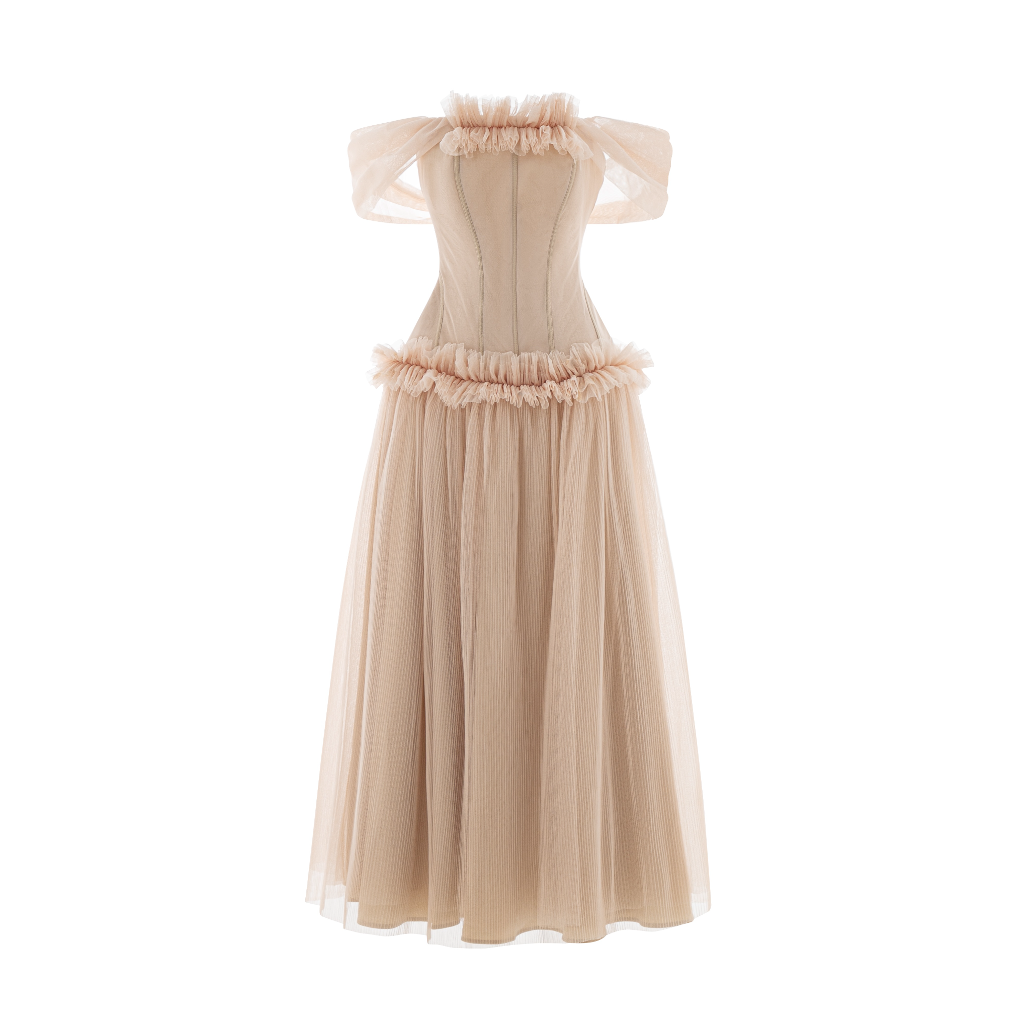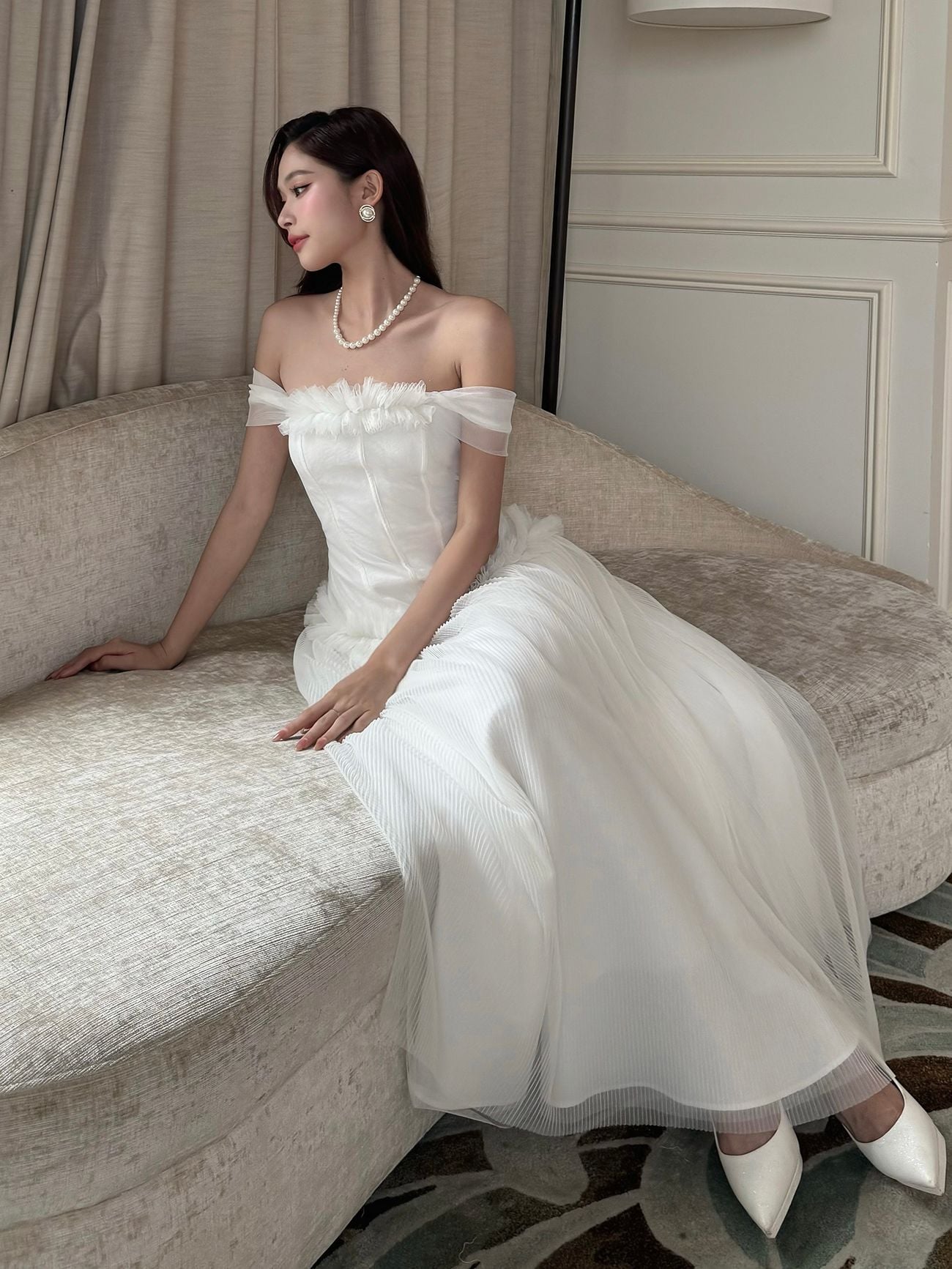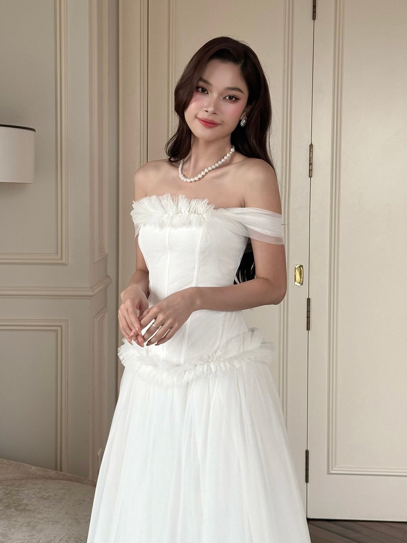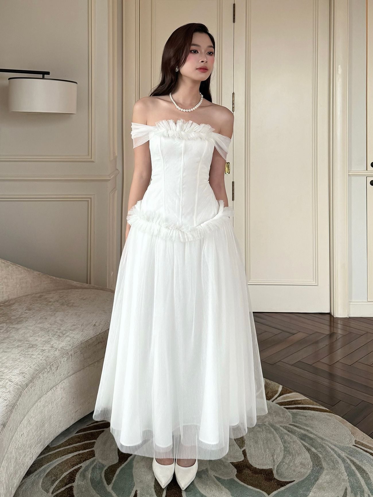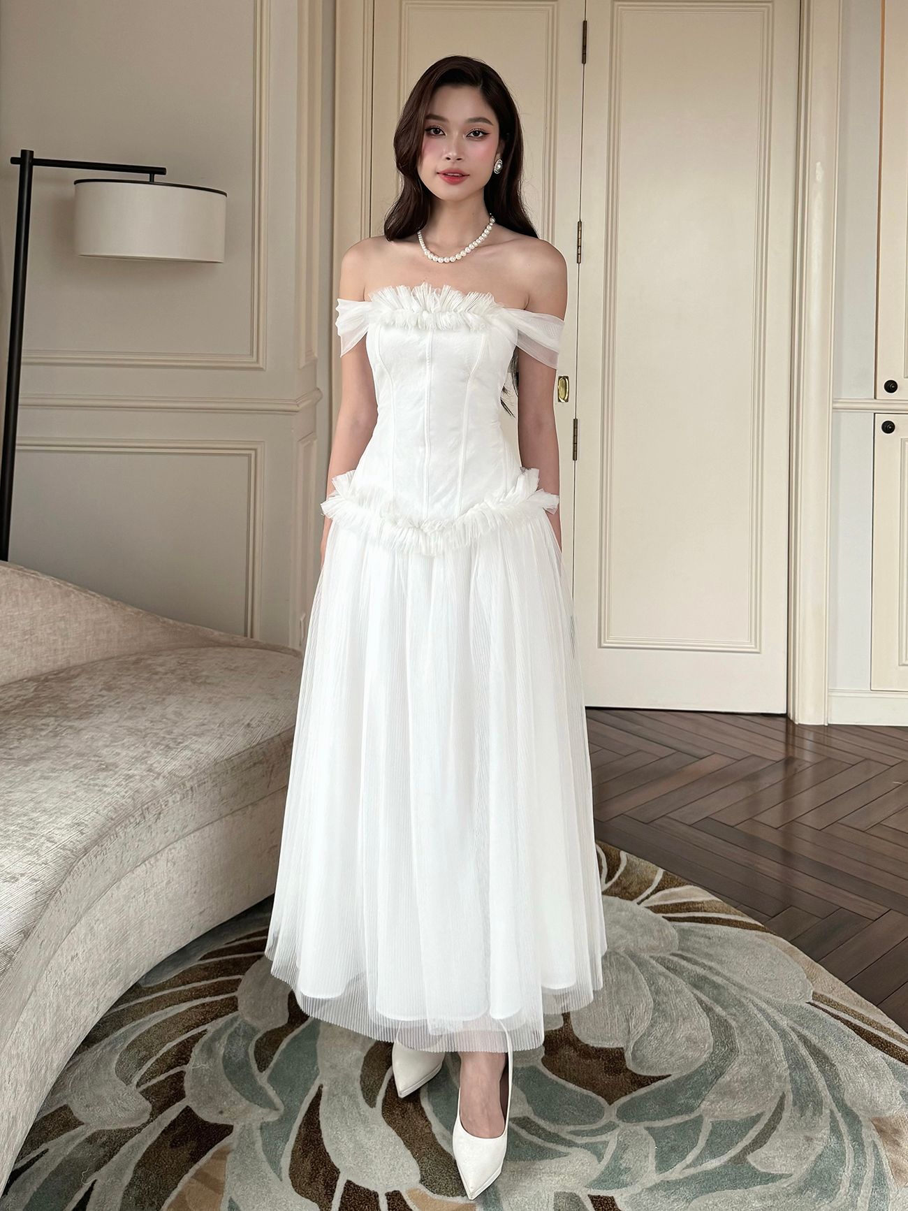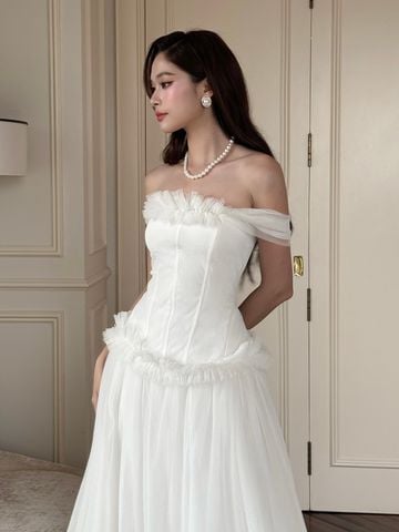 ▪ Tên sản phẩm : Đầm Xòe Dự Tiệc Trễ Vai Nhún Bèo Tùng Váy Xếp Ly Phối Lưới Sang Trọng