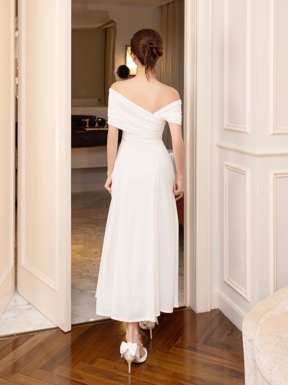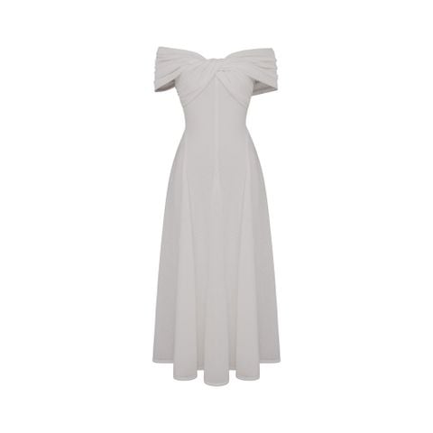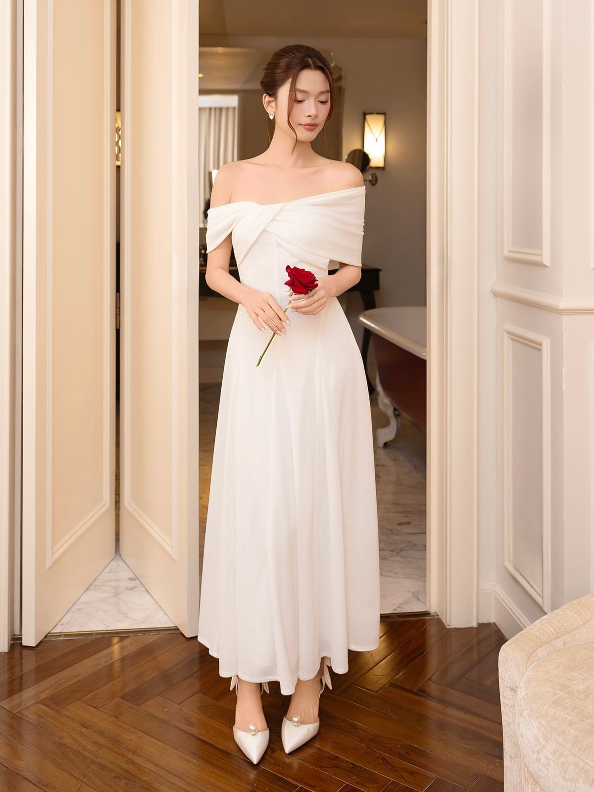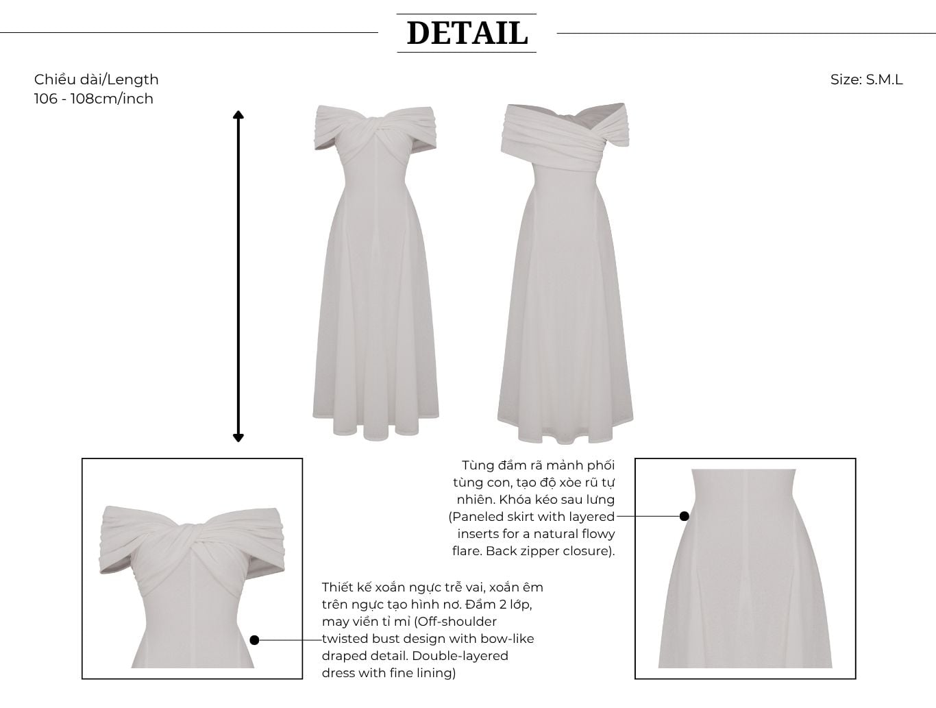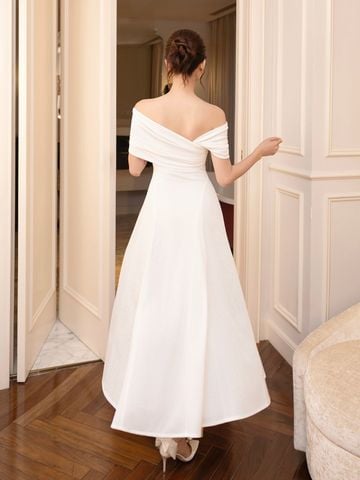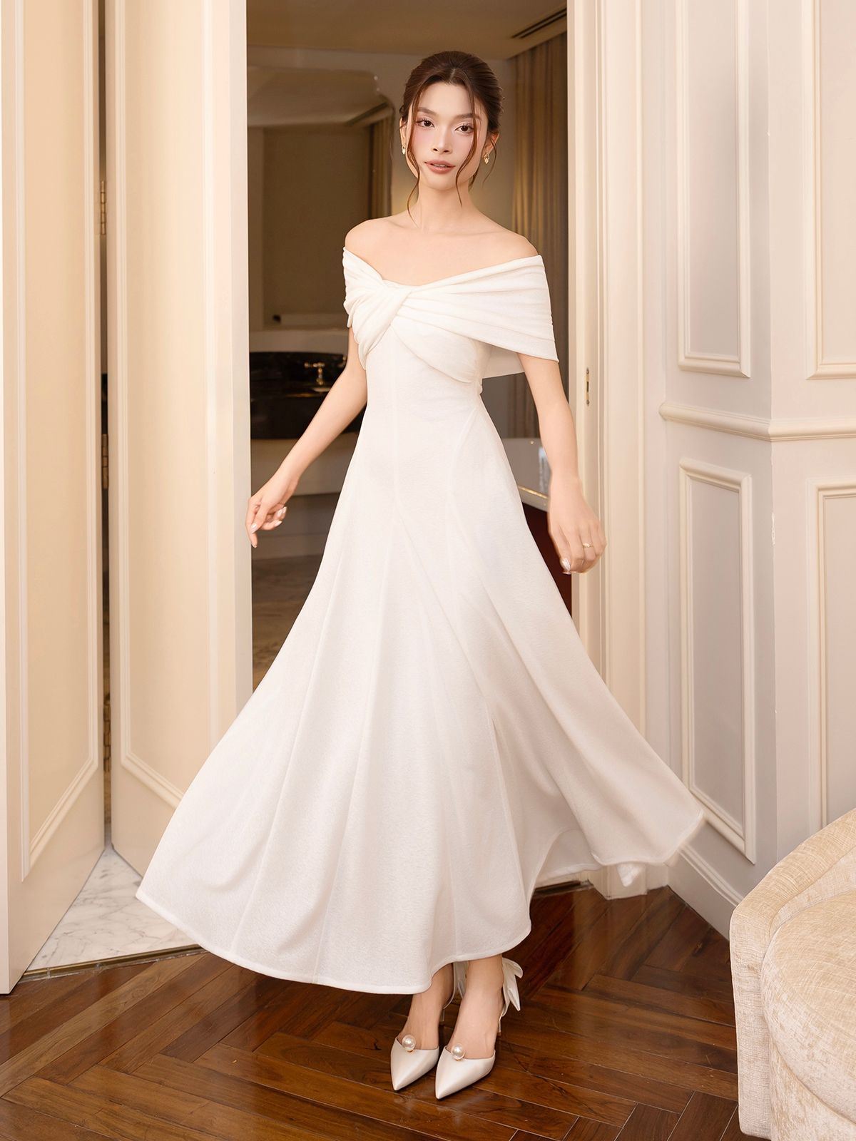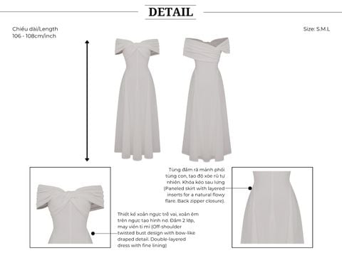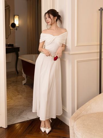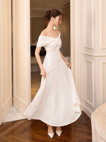 🔹 Thiết kế: Form đầm A dài xòe rũ, xoắn ngực trễ vai