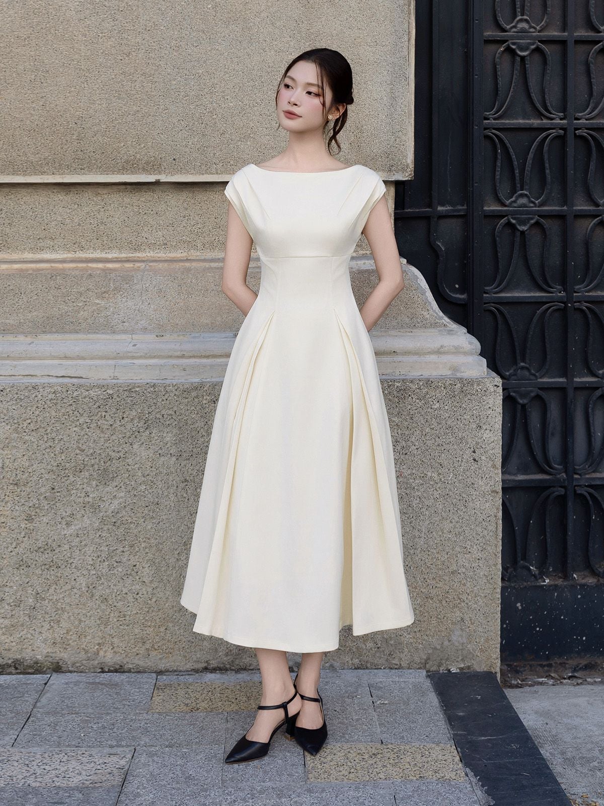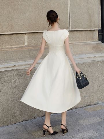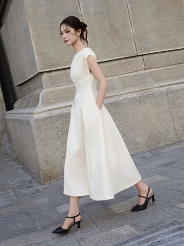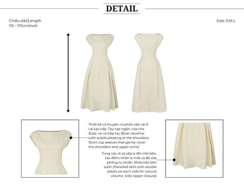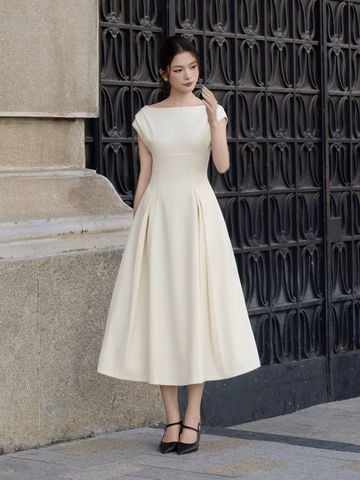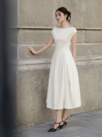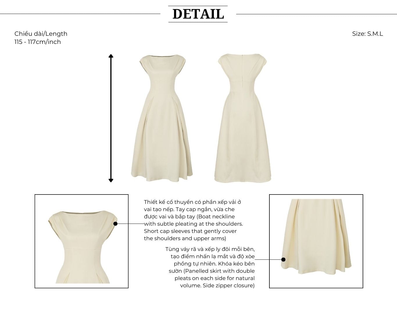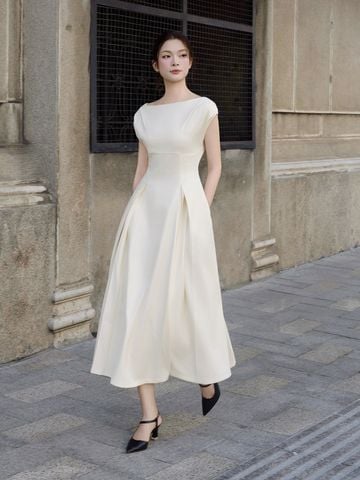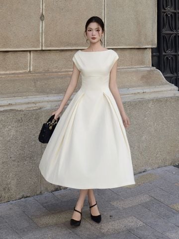 🔹 Phom đầm dài midi dáng xòe phồng nhẹ tạo sự cân đối cho tổng thể, đồng thời giúp nàng di chuyển thoải mái và mềm mại. Thiết kế cổ thuyền thanh thoát đi kèm phần xếp vải ở vai tạo nếp, mang lại hiệu ứng “vai gọn – cổ sáng” rất tinh tế. Tay cap ngắn vừa vặn giúp che vai và bắp tay khéo léo, nên nàng vẫn tự tin trong những ngày cần xuất hiện thật chỉn chu. Điểm nhấn đắt giá nằm ở tùng váy rã và đầm xếp ly đôi mỗi bên, tạo độ xòe phồng tự nhiên và khiến từng bước đi trông uyển chuyển hơn. Khóa kéo bên sườn giúp nàng mặc vào gọn gàng, giữ phom thẳng đẹp.