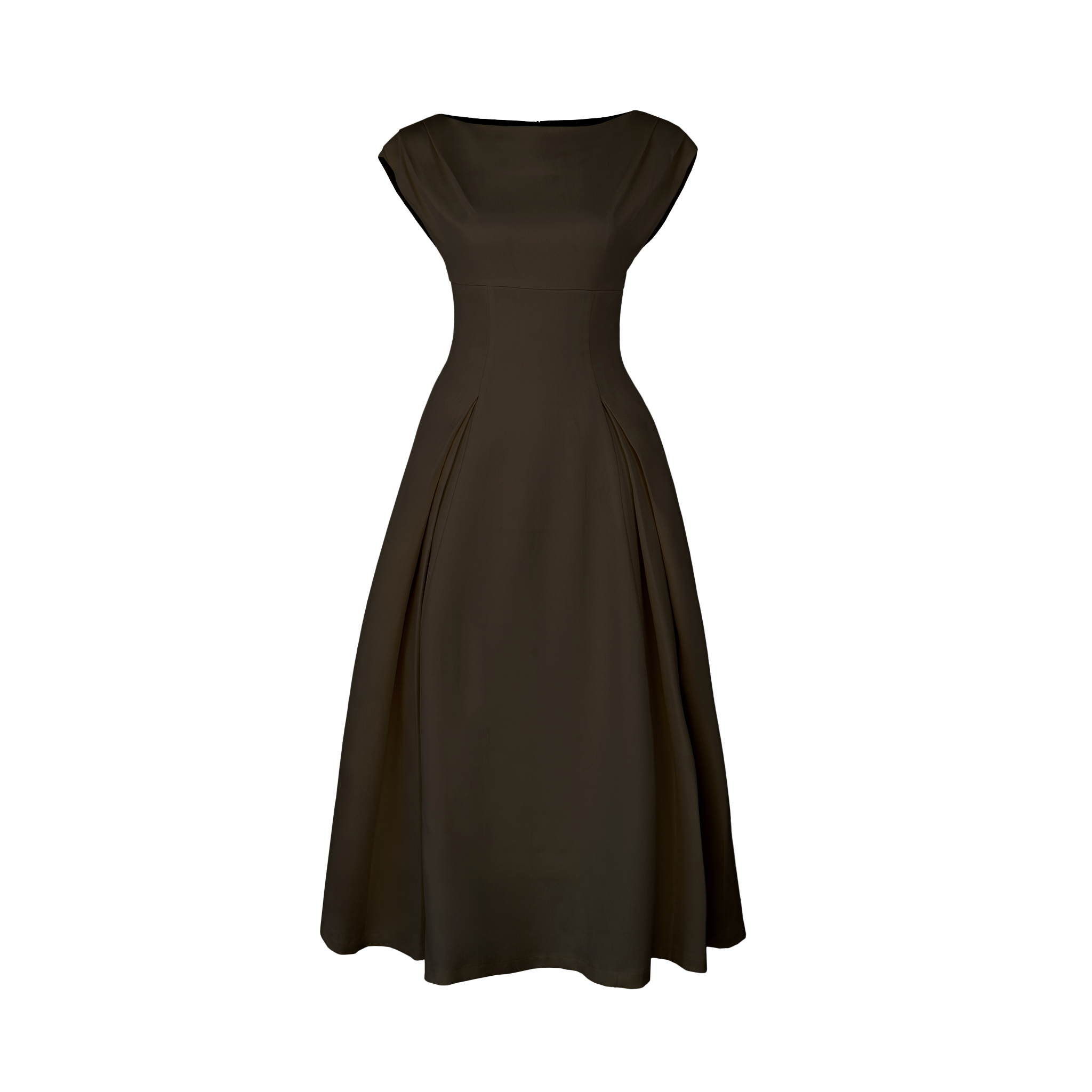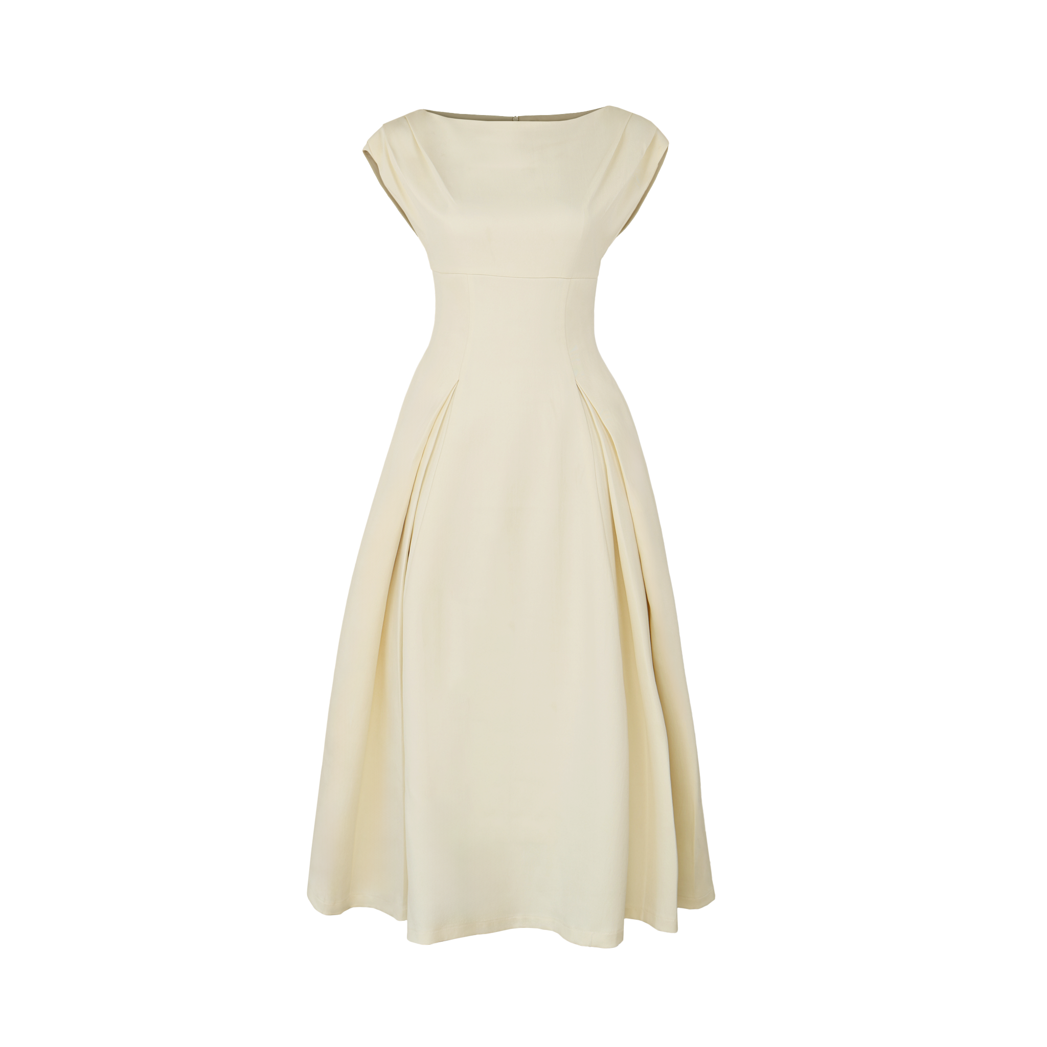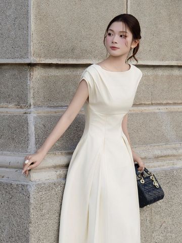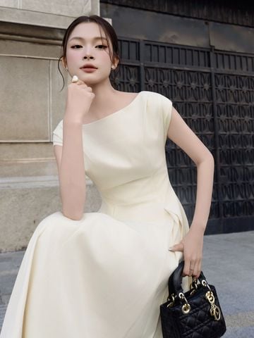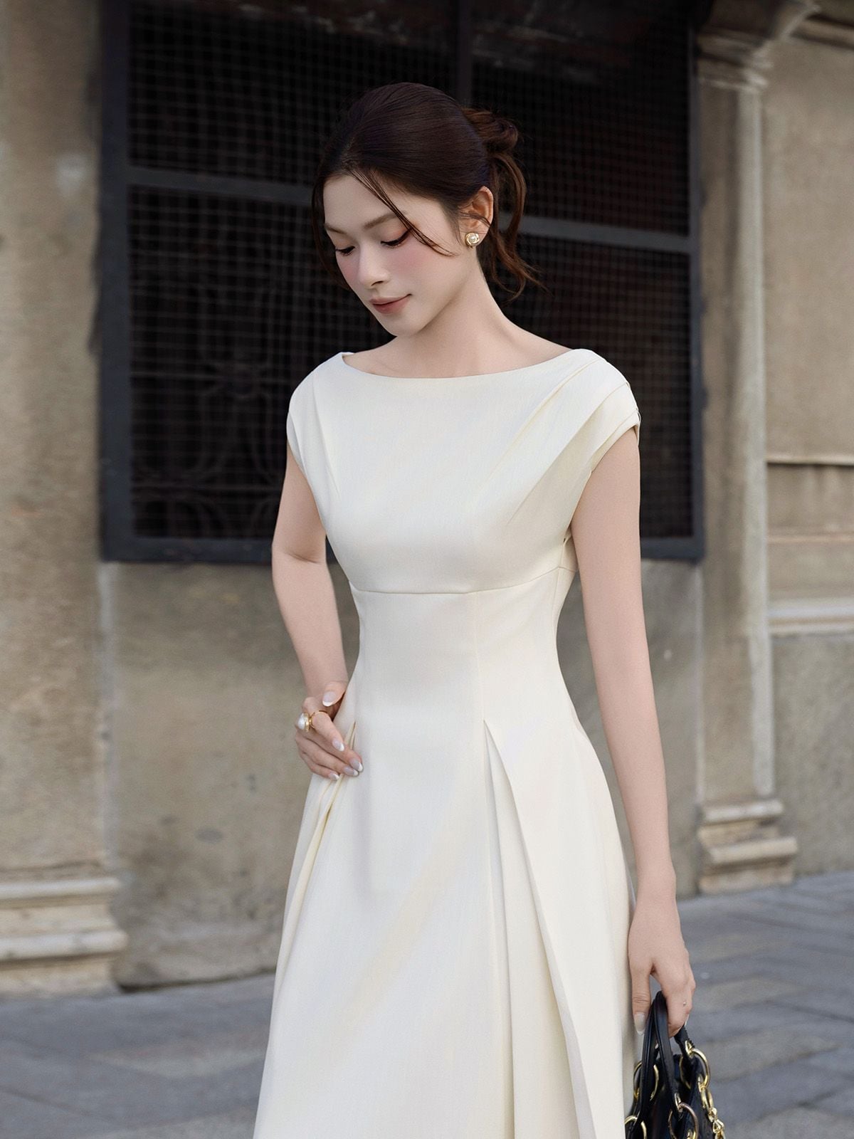 🔹 Phom đầm dài midi dáng xòe phồng nhẹ tạo sự cân đối cho tổng thể, đồng thời giúp nàng di chuyển thoải mái và mềm mại. Thiết kế cổ thuyền thanh thoát đi kèm phần xếp vải ở vai tạo nếp, mang lại hiệu ứng “vai gọn – cổ sáng” rất tinh tế. Tay cap ngắn vừa vặn giúp che vai và bắp tay khéo léo, nên nàng vẫn tự tin trong những ngày cần xuất hiện thật chỉn chu. Điểm nhấn đắt giá nằm ở tùng váy rã và đầm xếp ly đôi mỗi bên, tạo độ xòe phồng tự nhiên và khiến từng bước đi trông uyển chuyển hơn. Khóa kéo bên sườn giúp nàng mặc vào gọn gàng, giữ phom thẳng đẹp.