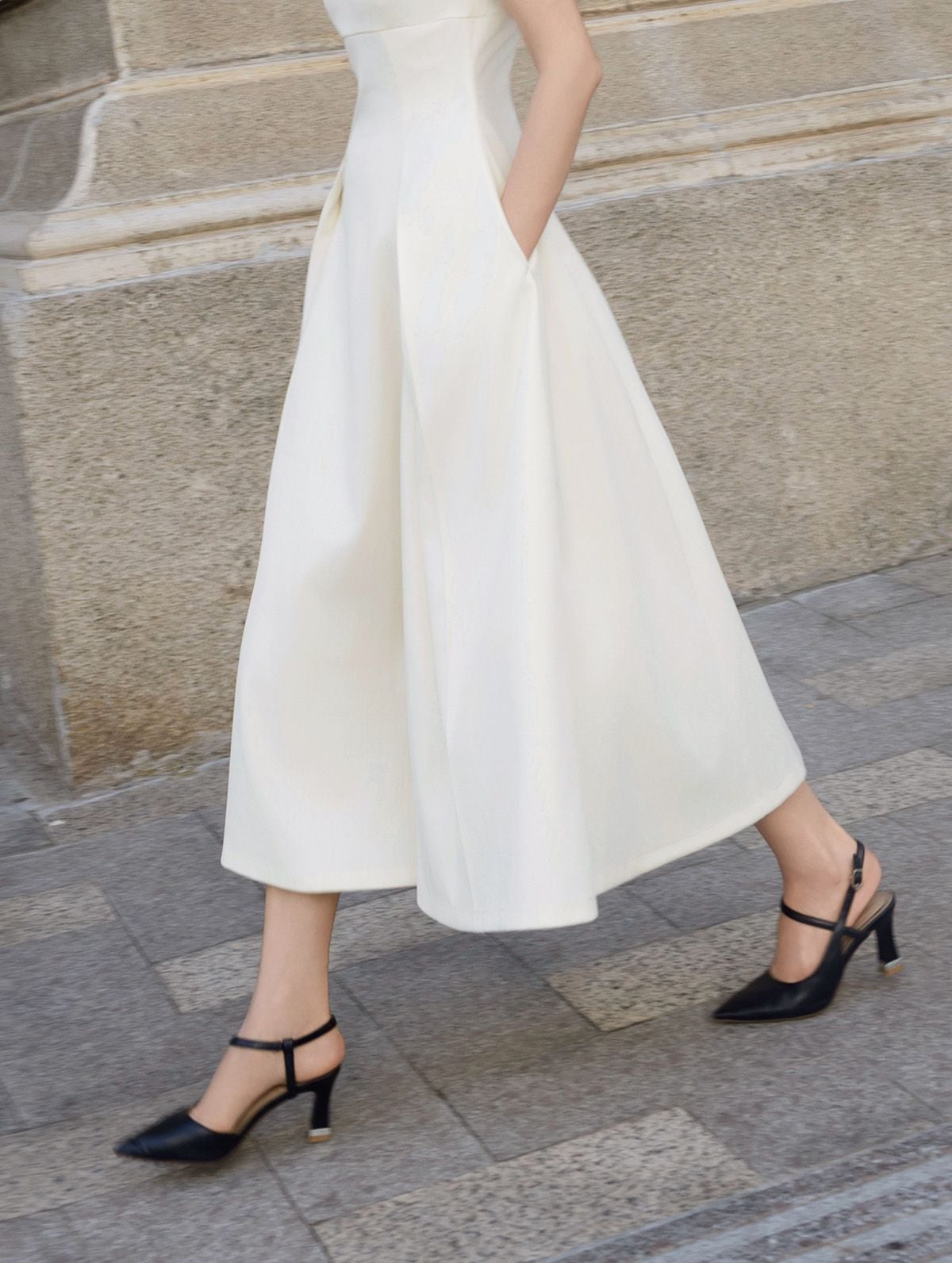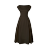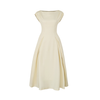 🔹 Thiết kế: Form đầm midi dáng xòe phồng nhẹ, cổ thuyền, tay cap