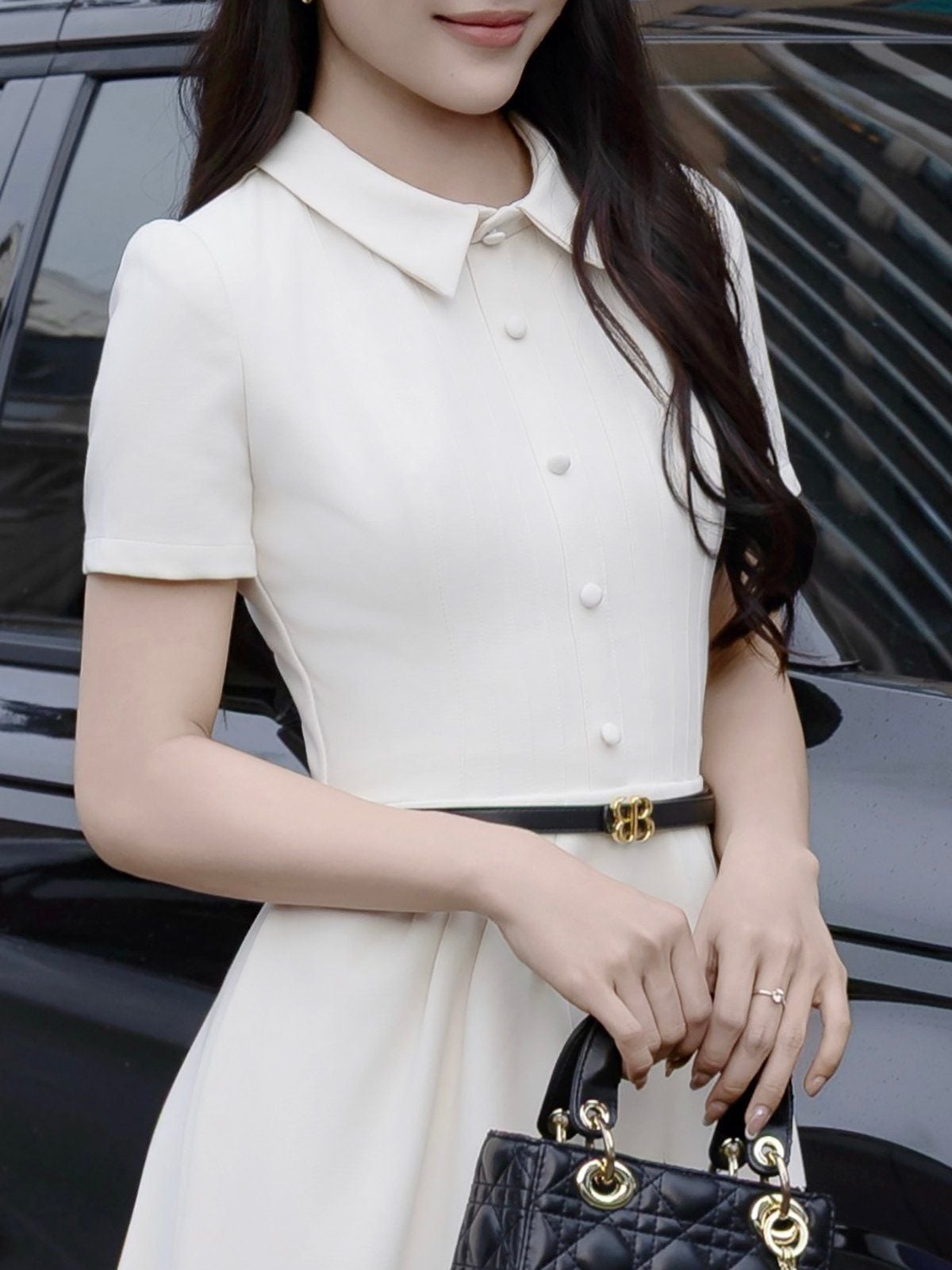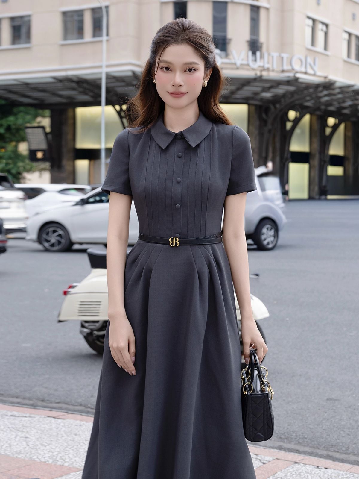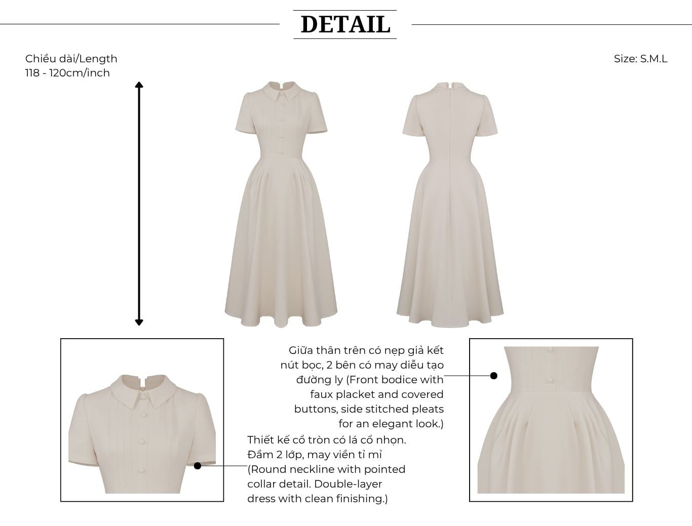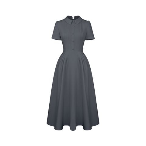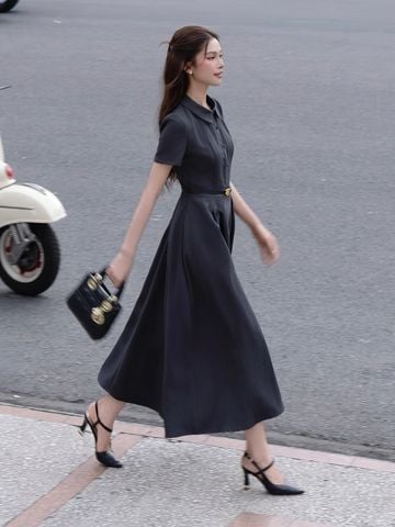🔹 Với form đầm dài A, thân trên vừa vặn, phần tùng xòe nhẹ cùng các đường ly chạy dọc giúp tôn dáng và tạo hiệu ứng eo thon dáng cao. Đầm tay ngắn, cổ tròn mang vẻ cổ điển tinh tế, trong khi hàng nút bọc giả và chi tiết may diễu hai bên làm tăng chiều sâu cho tổng thể.