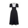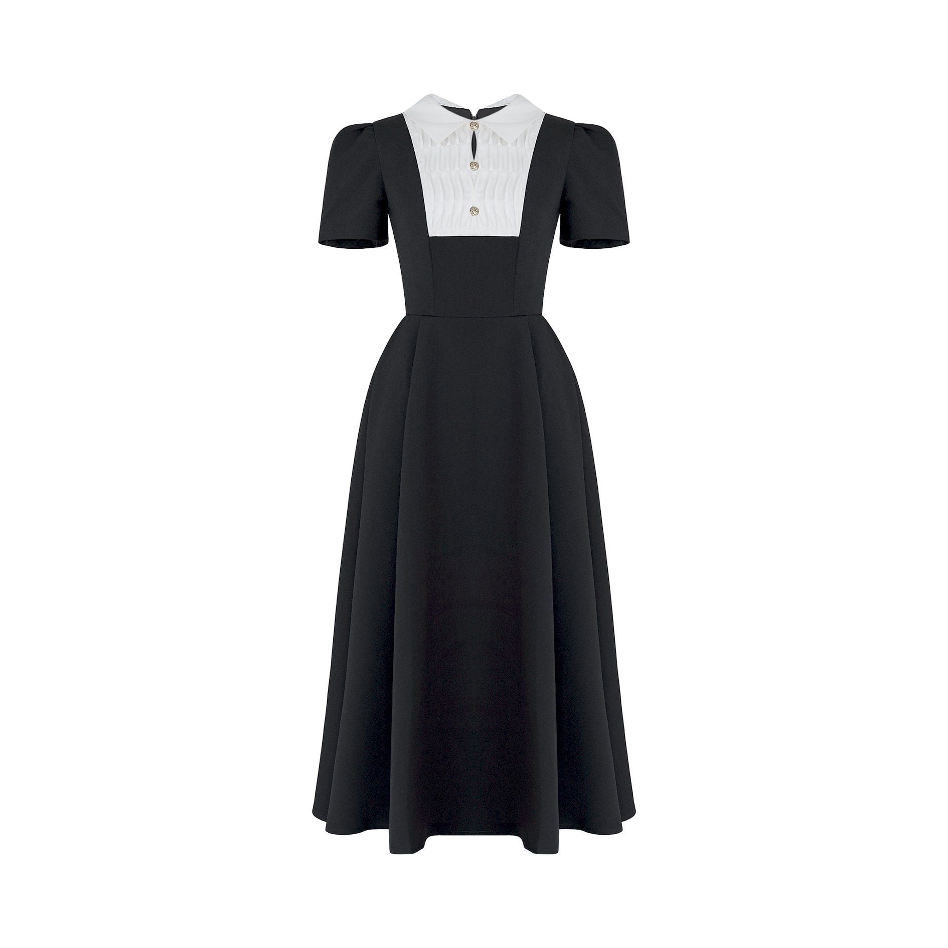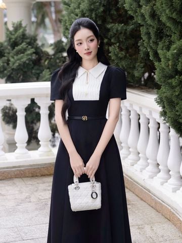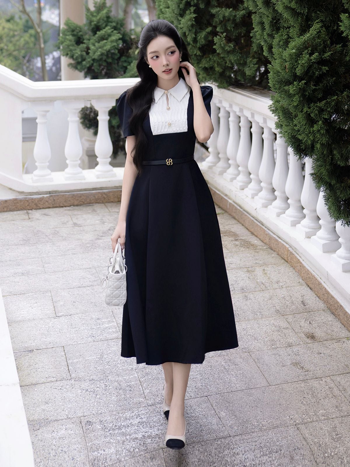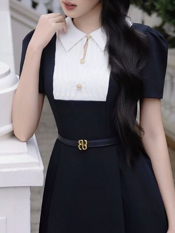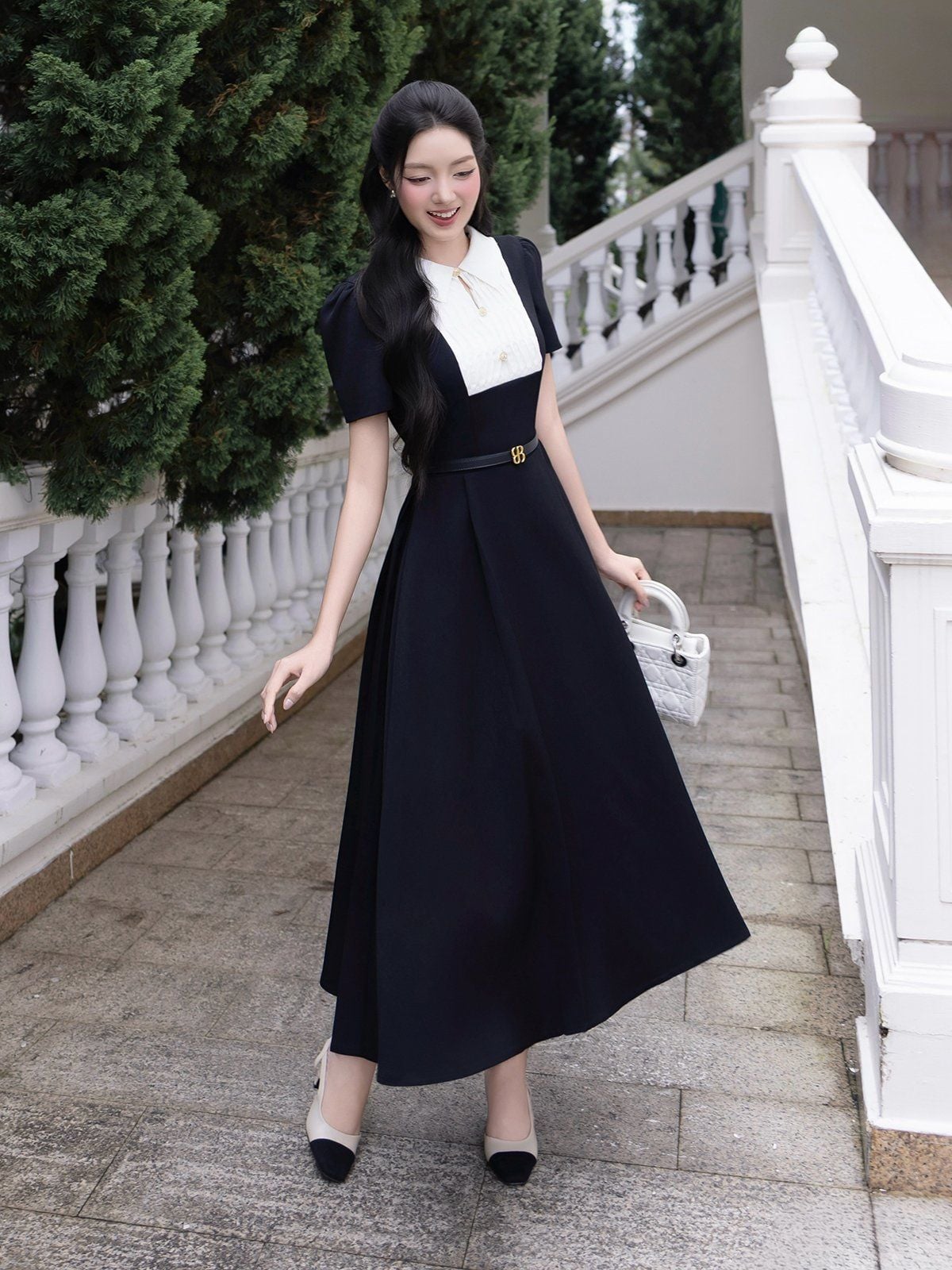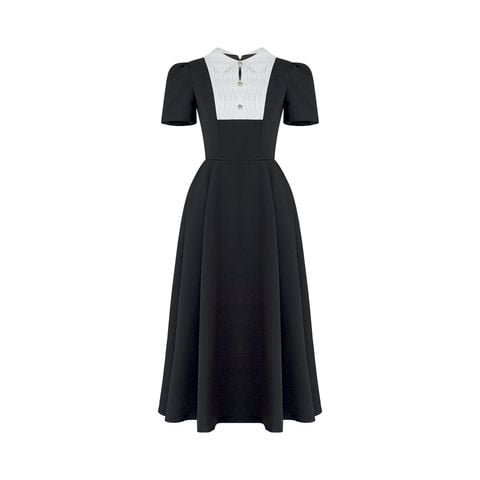 🔹 Form đầm midi dáng xòe mềm, phần thân trên ôm nhẹ tạo hiệu ứng tôn eo, giúp vóc dáng trông cao và gọn hơn. Thiết kế cổ áo và ngực phối trắng tạo điểm nhấn nổi bật trên nền đầm đen, gợi cảm giác như một chiếc đầm cúp ngực được kết hợp cùng áo sơ mi cổ vest, rất phù hợp với môi trường văn phòng. Ngực xếp ly may lật zic zac tỉ mỉ giúp tổng thể đầm xếp ly vừa lạ mắt vừa cao cấp, đi cùng hàng nút kim loại nhỏ tinh xảo ở giữa. Tay ngắn mo nhẹ ở vai lấy cảm hứng từ tay áo vest, tạo cảm giác quyền lực mà vẫn mềm mại.