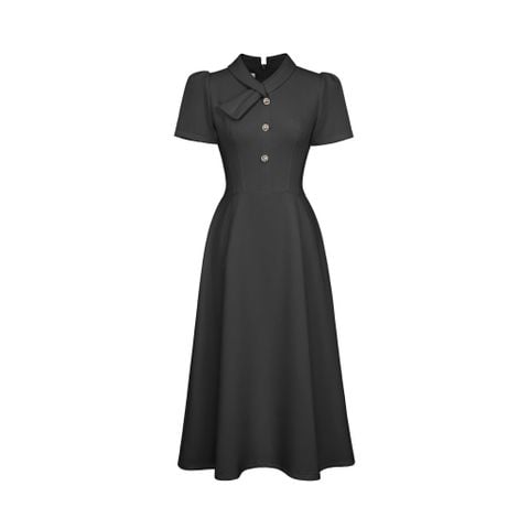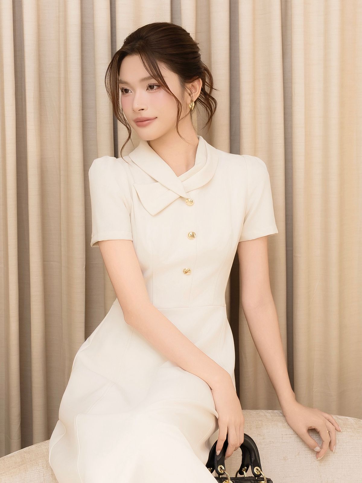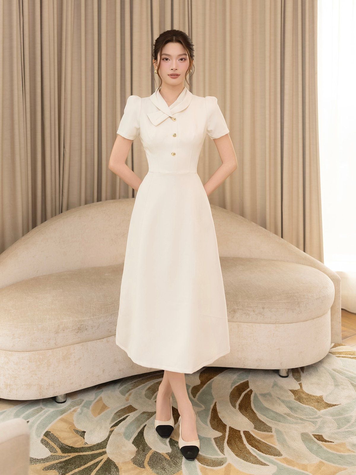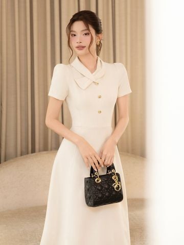 🔹 Sản phẩm dành cho cô nàng yêu phong cách quiet luxury, đề cao sự chỉn chu và tính ứng dụng cao: đi làm mỗi ngày vẫn nổi bật, cuối tuần đổi gió vẫn thời thượng. Phom đầm A xòe dài tôn vòng eo, cân bằng đường cong cơ thể và tạo hiệu ứng chân thon. Đầm cổ tim cách điệu phối lá cổ đuôi nơ nhẹ nhàng, kết hợp nẹp giả giữa thân và hàng nút kim loại chống rỉ mang đến điểm nhấn sang trọng.