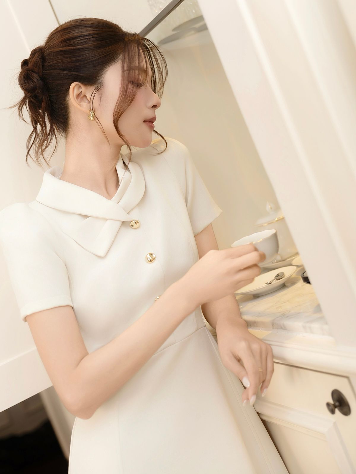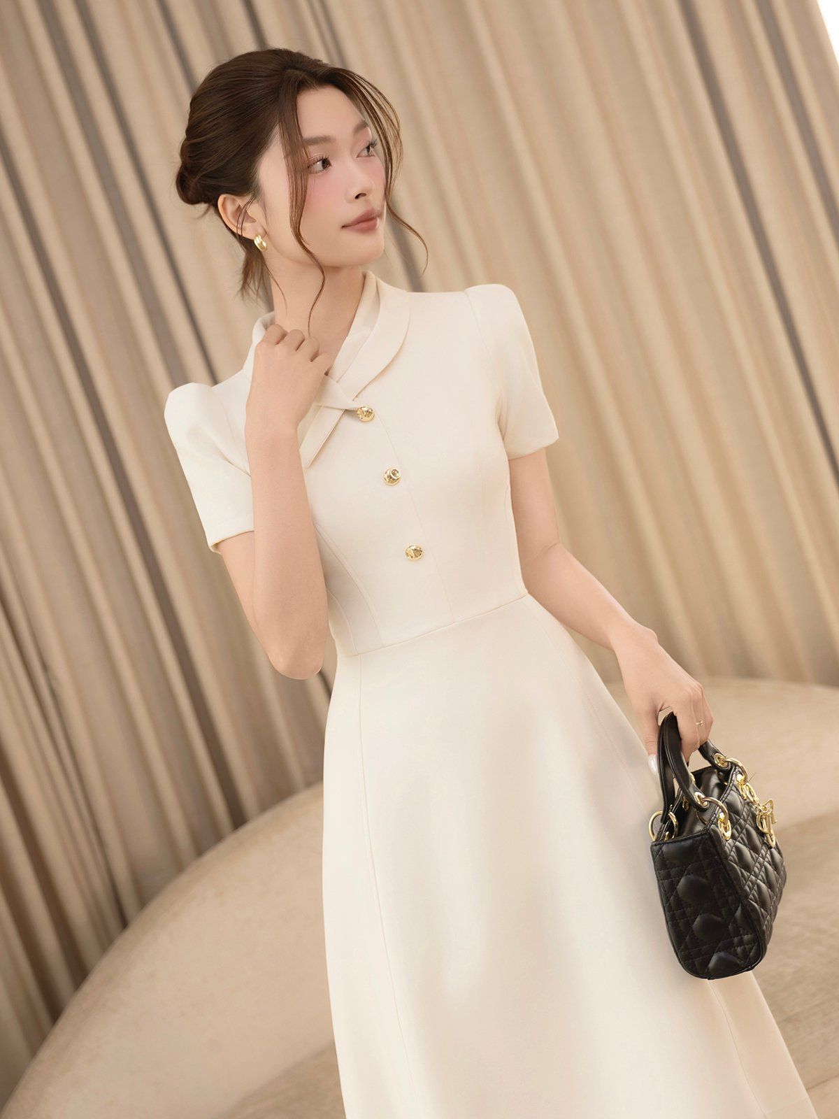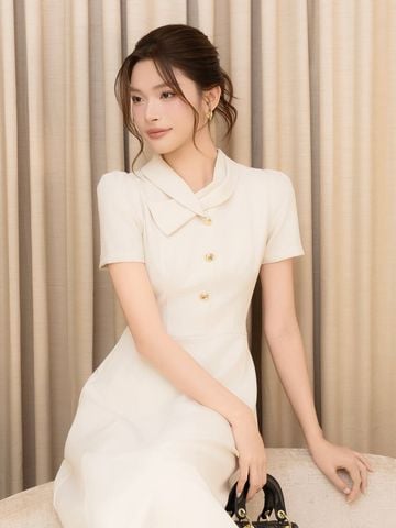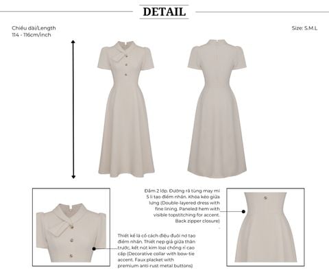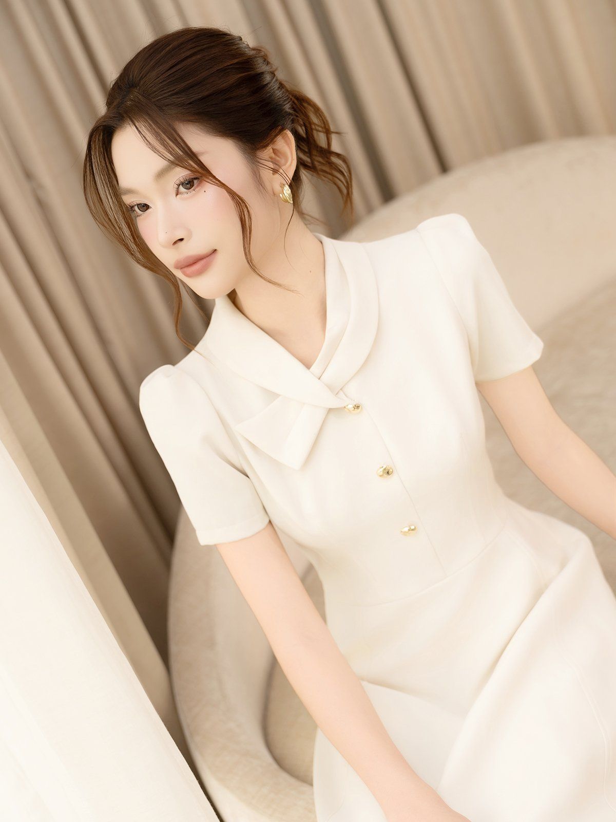 🔹 Sản phẩm dành cho cô nàng yêu phong cách quiet luxury, đề cao sự chỉn chu và tính ứng dụng cao: đi làm mỗi ngày vẫn nổi bật, cuối tuần đổi gió vẫn thời thượng. Phom đầm A xòe dài tôn vòng eo, cân bằng đường cong cơ thể và tạo hiệu ứng chân thon. Đầm cổ tim cách điệu phối lá cổ đuôi nơ nhẹ nhàng, kết hợp nẹp giả giữa thân và hàng nút kim loại chống rỉ mang đến điểm nhấn sang trọng.