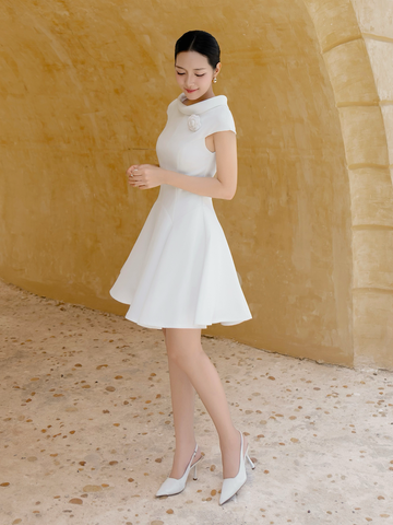 🔹 Sản phẩm dành cho những cô nàng yêu thích phong cách tinh tế, chỉn chu nhưng vẫn muốn giữ sự mềm mại và nữ tính trong từng đường nét. Với form đầm ngắn dáng xòe, tay cap nhỏ nhắn cùng chi tiết cổ thuyền co lá cổ lật tạo điểm nhấn, chiếc đầm tôn lên vóc dáng thanh thoát mà không kém phần duyên dáng. Đường cắt tinh xảo, tùng đầm rã mảnh với những vòng cung cách điệu mang lại cảm giác uyển chuyển khi nàng di chuyển.