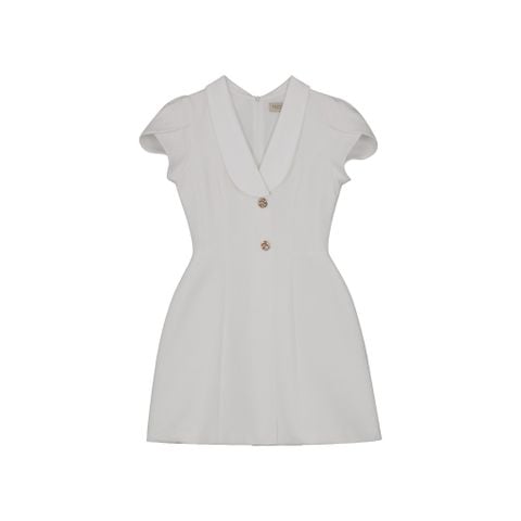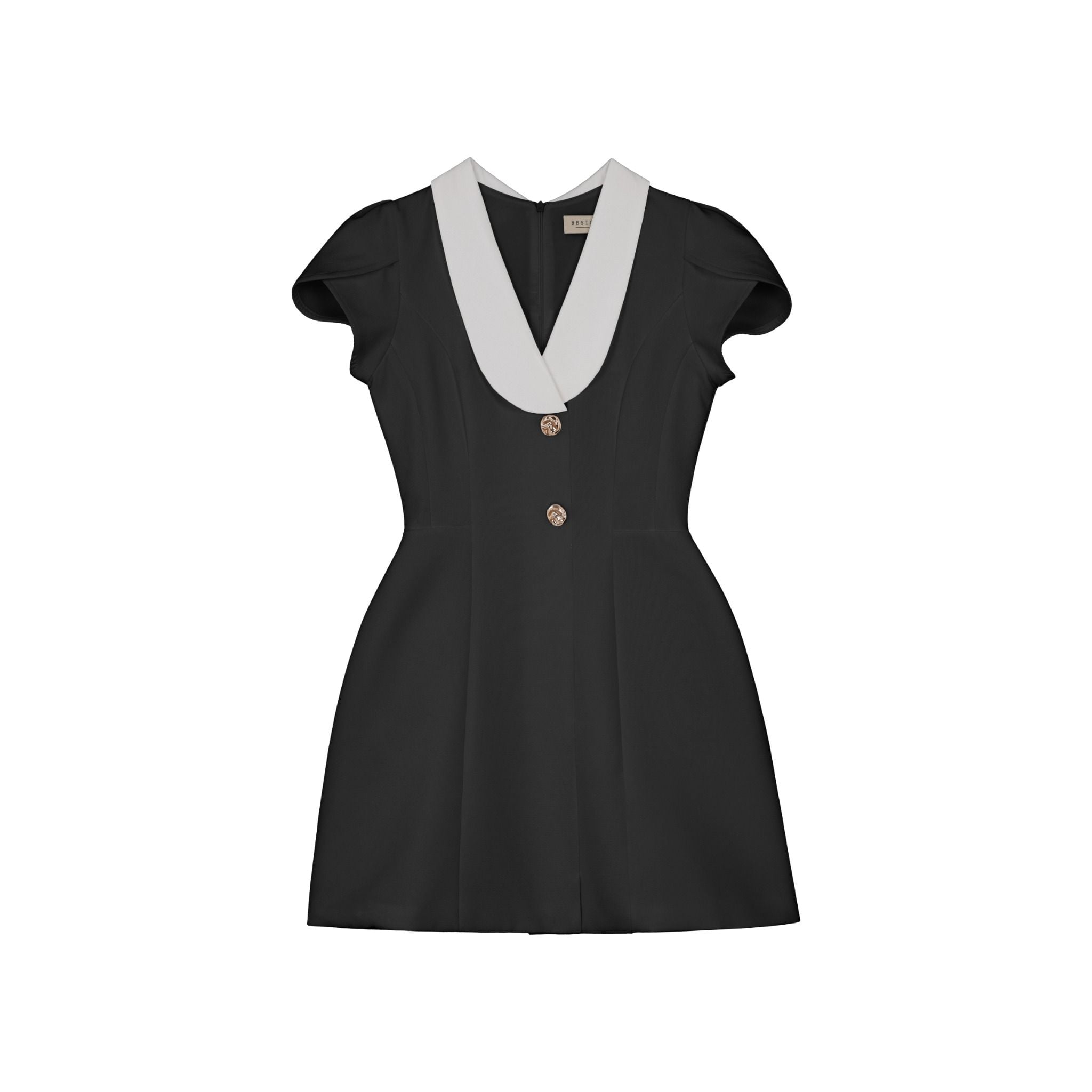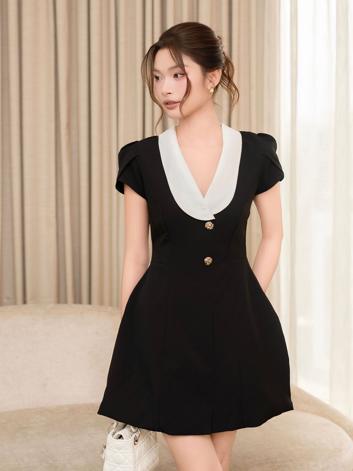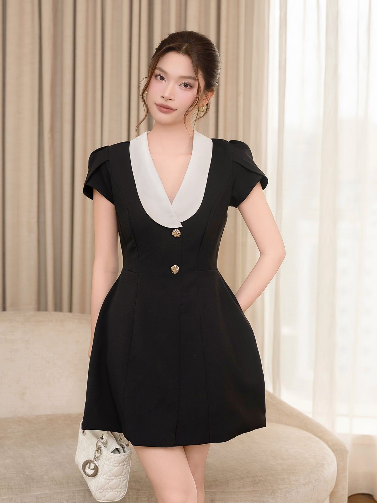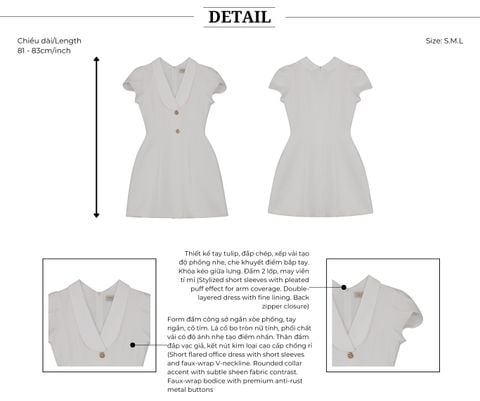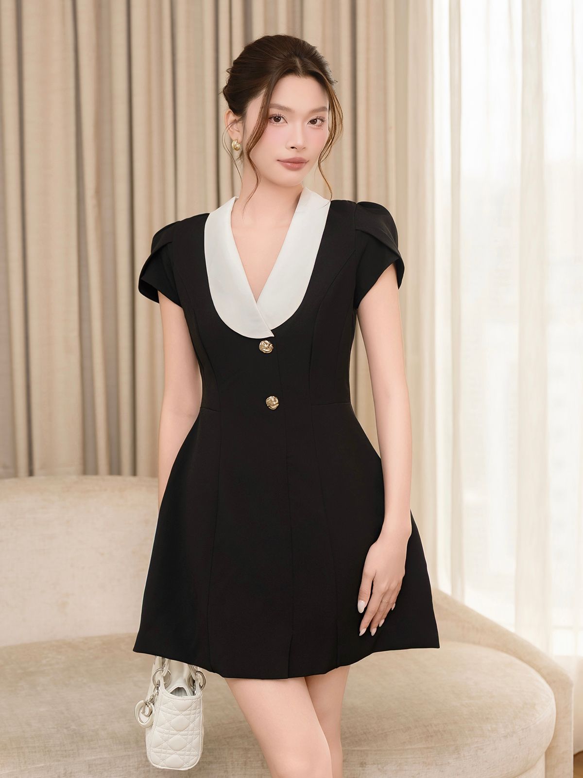 🔹 Phom đầm công sở ngắn xòe phồng tôn vòng eo và tạo hiệu ứng đôi chân thon dài. Cổ tim đắp vạt cân bằng độ sâu vừa phải, đi kèm lá cổ bo tròn nữ tính và hai nút kim loại cao cấp chống rỉ tạo điểm nhấn tinh tế. Tay tulip đắp chép với các nếp xếp nhẹ nhàng giúp che khuyết điểm bắp tay, hoàn thiện vẻ ngoài gọn gàng của một chiếc đầm tay ngắn.