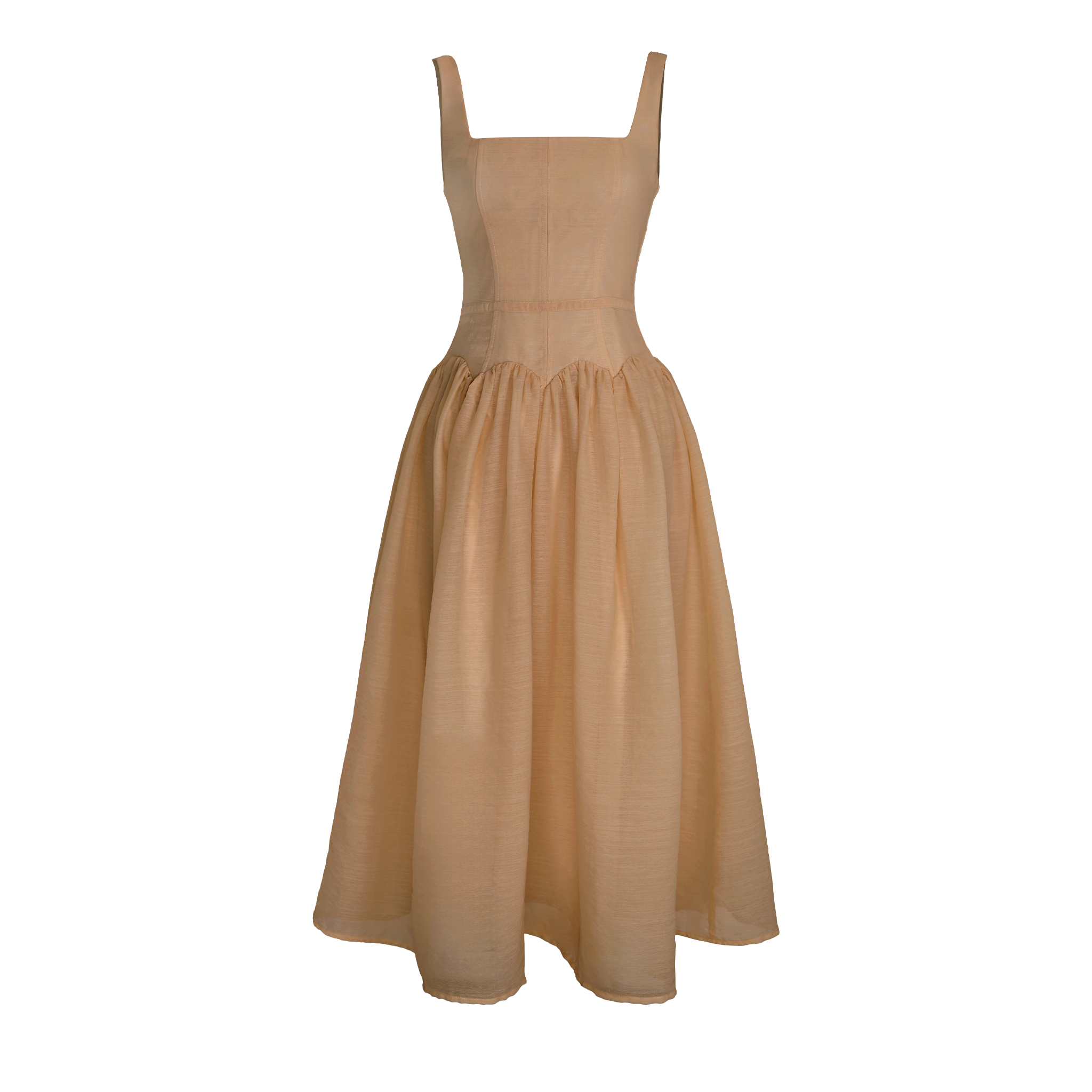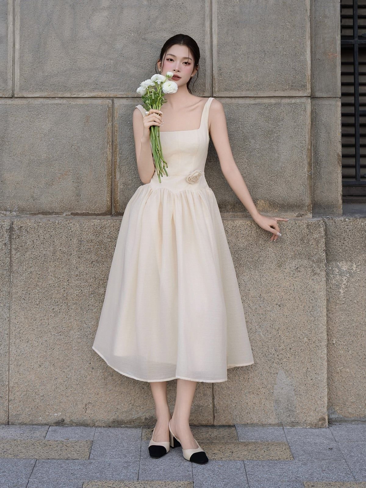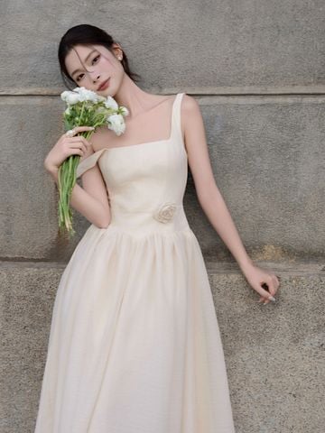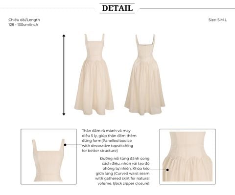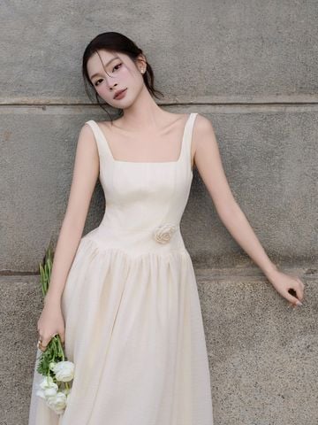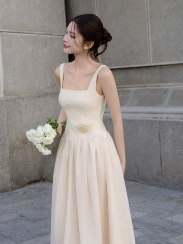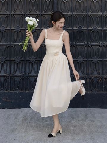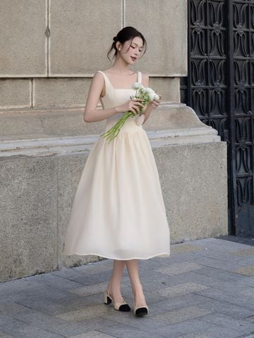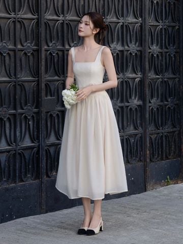 🔹 Về form dáng, đây là mẫu đầm xòe dáng dài với thiết kế đầm 2 dây và cổ vuông thanh thoát, giúp phần vai cổ trông gọn gàng và nữ tính. Thân đầm được rã mảnh và may diễu 5 ly, tạo cấu trúc đứng form vừa đủ để tôn dáng mà không cứng nhắc. Phần nối tùng được đánh cong cách điệu, kết hợp kỹ thuật nhún vải tinh tế giúp váy có độ phồng tự nhiên, mang lại chuyển động mềm mại khi nàng bước đi. Khóa kéo giữa lưng hỗ trợ mặc dễ dàng và giữ tổng thể gọn gàng.