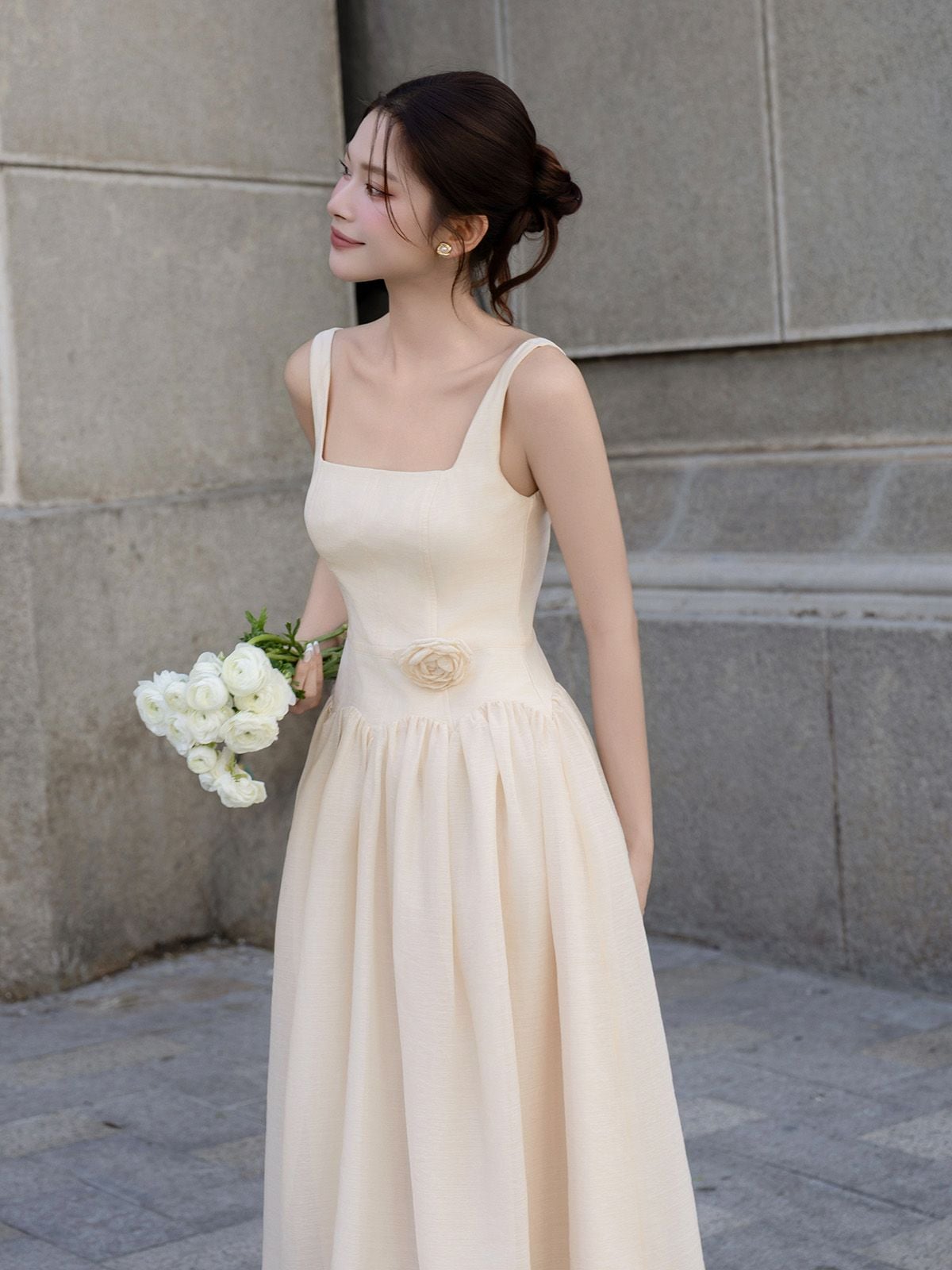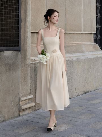 🔹 Thiết kế: Form đầm dài, dáng xòe, 2 dây, cổ vuông