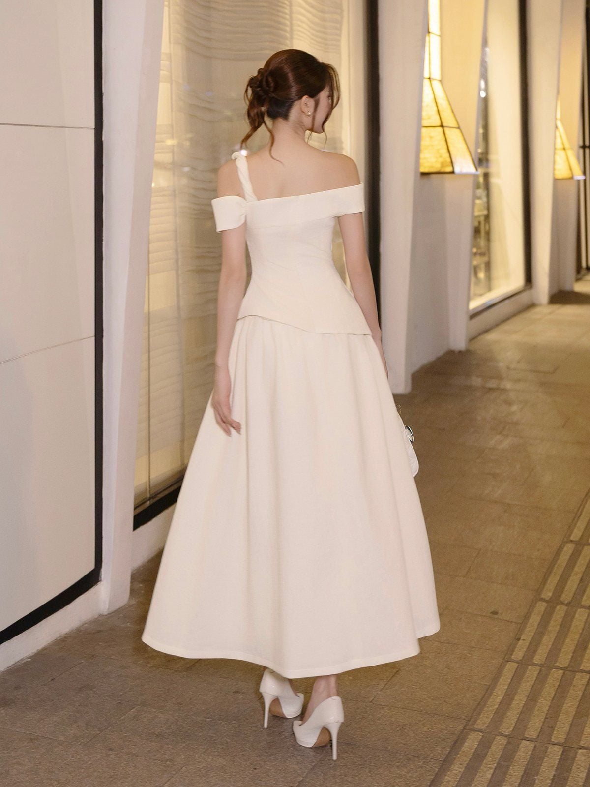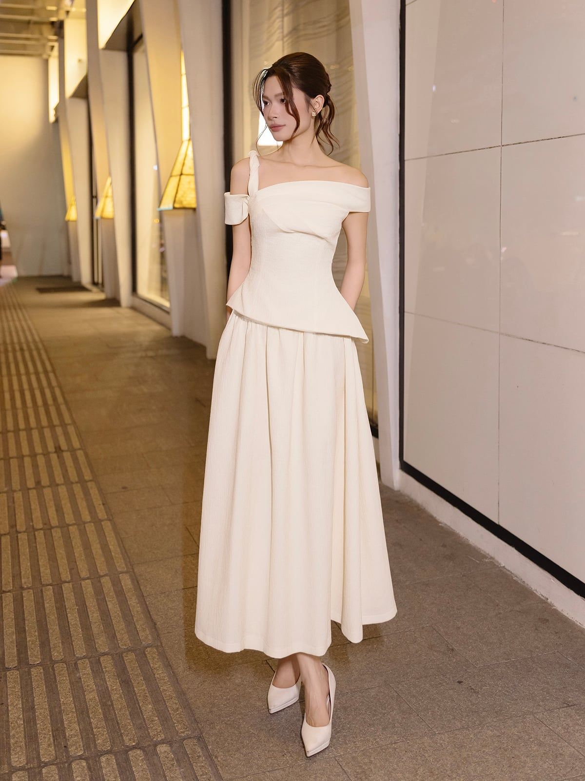 🔹 Thiết kế: Form đầm dài xòe phồng, trễ vai có dây xoắn 1 bên vai