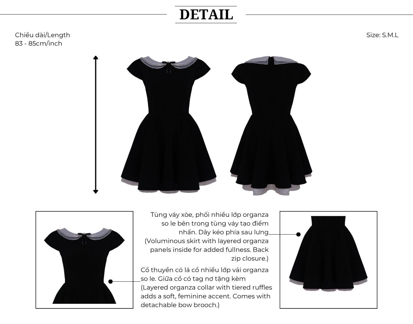 🔹 Form đầm A xòe phồng, độ dài đầm ngắn trên gối giúp đôi chân thanh thoát hơn, tạo hiệu ứng dáng cao và gọn. Phần cổ thuyền phối cổ sen nhiều lớp vải organza so le, điểm xuyết tag nơ nhỏ xinh ở giữa giúp tổng thể chiếc đầm tiệc thêm mềm mại, nữ tính. Tùng váy xòe rộng, phối nhiều lớp organza bên trong tạo độ phồng tự nhiên, giúp mỗi bước chân của nàng luôn bồng bềnh và nổi bật trong mọi bữa tiệc.