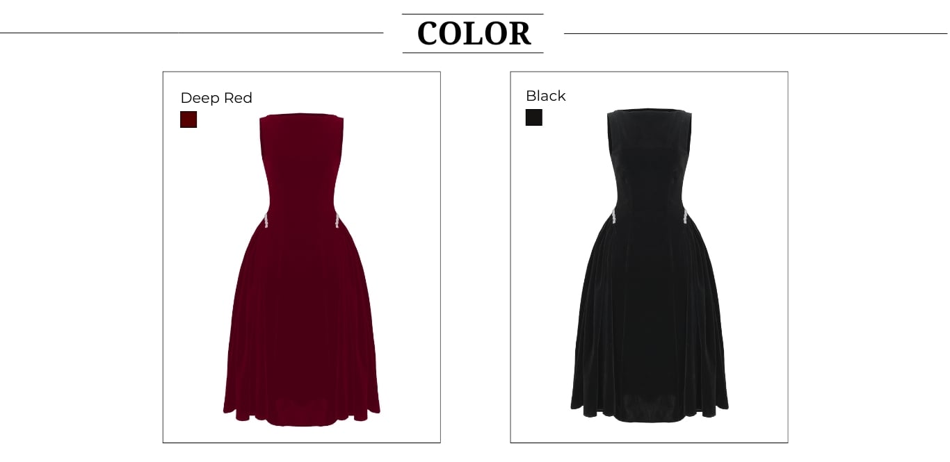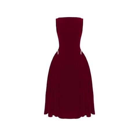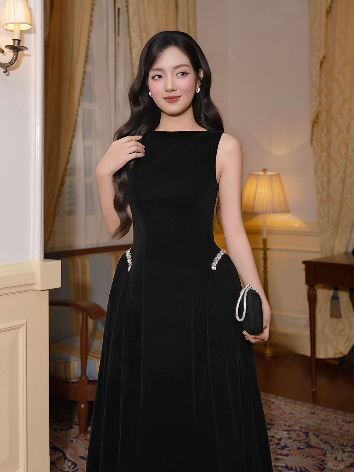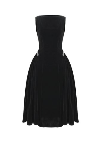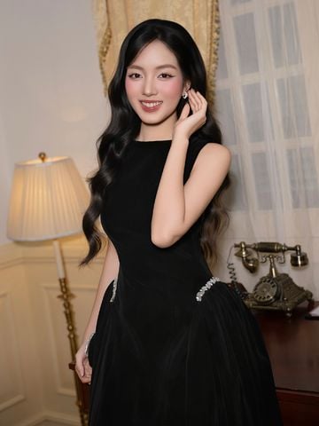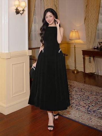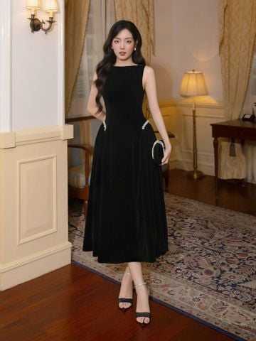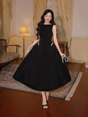 🔹 Form đầm dài dáng midi với đầm xòe nhẹ tạo nên tỷ lệ cơ thể cân đối và mềm mại. Phần cổ thuyền kín đáo giúp phần vai và cổ trông thanh thoát, trong khi thiết kế không tay mang lại sự gọn gàng, hiện đại. Thân trên được xử lý tối giản để tôn lên đường nét vóc dáng, kết hợp chi tiết tùng váy nhún hai bên giúp tạo độ phồng tự nhiên, mang lại hiệu ứng eo thon và hông đầy quyến rũ. Điểm nhấn đắt giá của chiếc đầm nhung này nằm ở chi tiết kết dây đá xoàn cao cấp tại hai bên hông, vừa tinh xảo vừa đủ nổi bật để thu hút ánh nhìn.