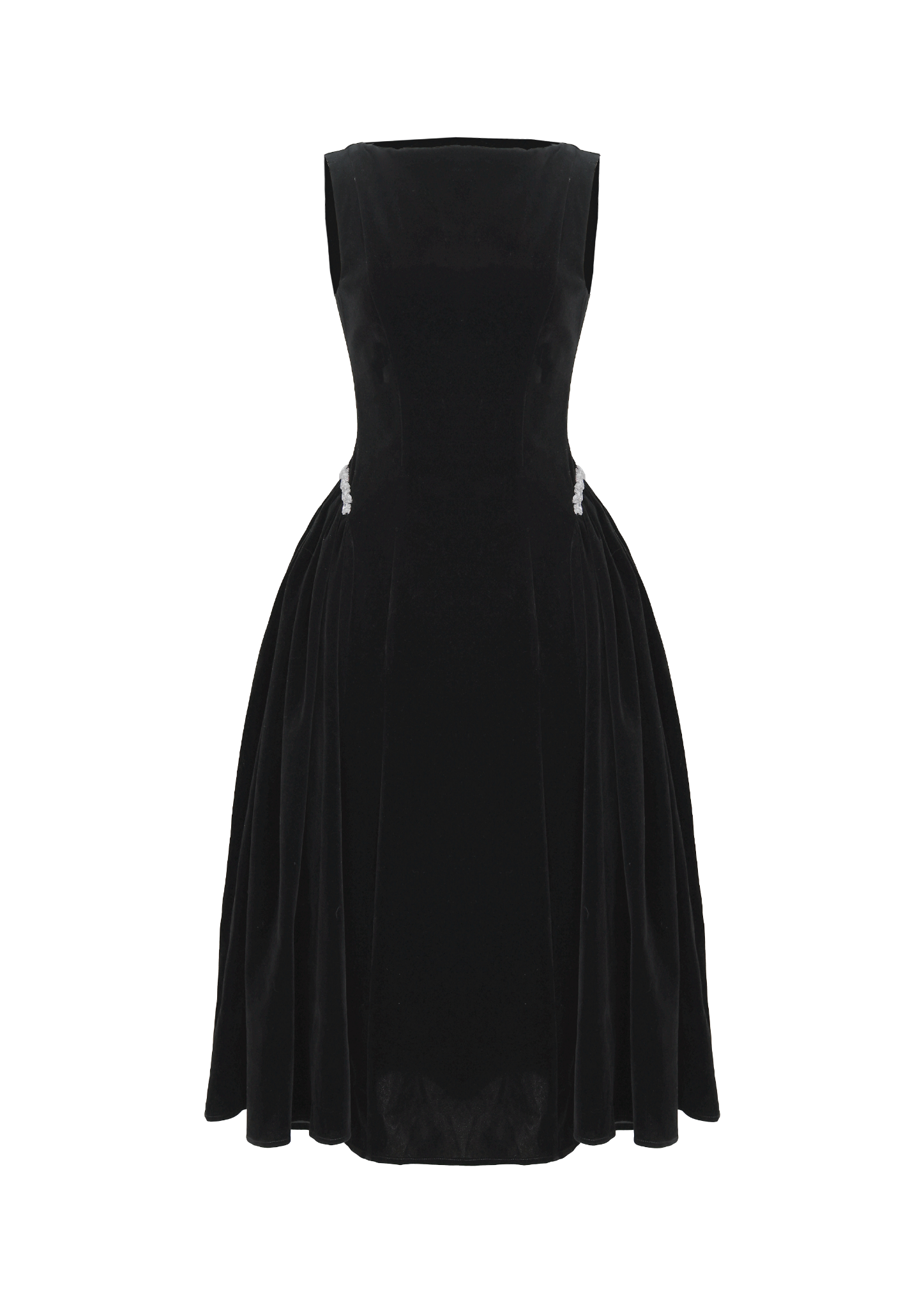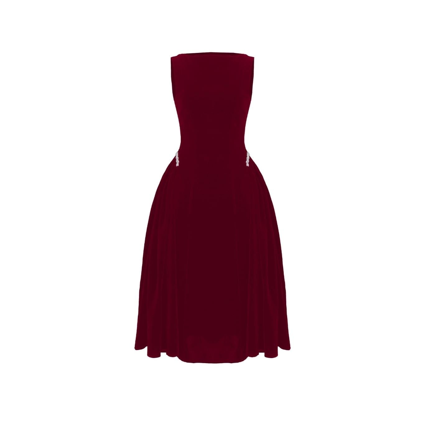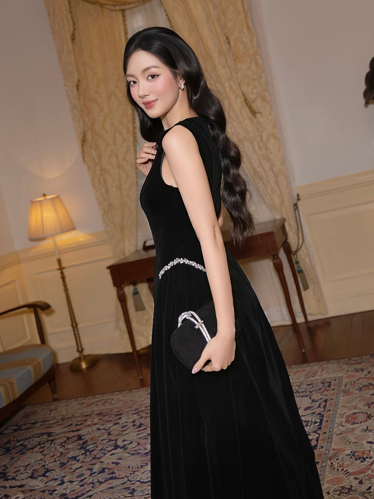 🔹 Form đầm dài dáng midi với đầm xòe nhẹ tạo nên tỷ lệ cơ thể cân đối và mềm mại. Phần cổ thuyền kín đáo giúp phần vai và cổ trông thanh thoát, trong khi thiết kế không tay mang lại sự gọn gàng, hiện đại. Thân trên được xử lý tối giản để tôn lên đường nét vóc dáng, kết hợp chi tiết tùng váy nhún hai bên giúp tạo độ phồng tự nhiên, mang lại hiệu ứng eo thon và hông đầy quyến rũ. Điểm nhấn đắt giá của chiếc đầm nhung này nằm ở chi tiết kết dây đá xoàn cao cấp tại hai bên hông, vừa tinh xảo vừa đủ nổi bật để thu hút ánh nhìn.