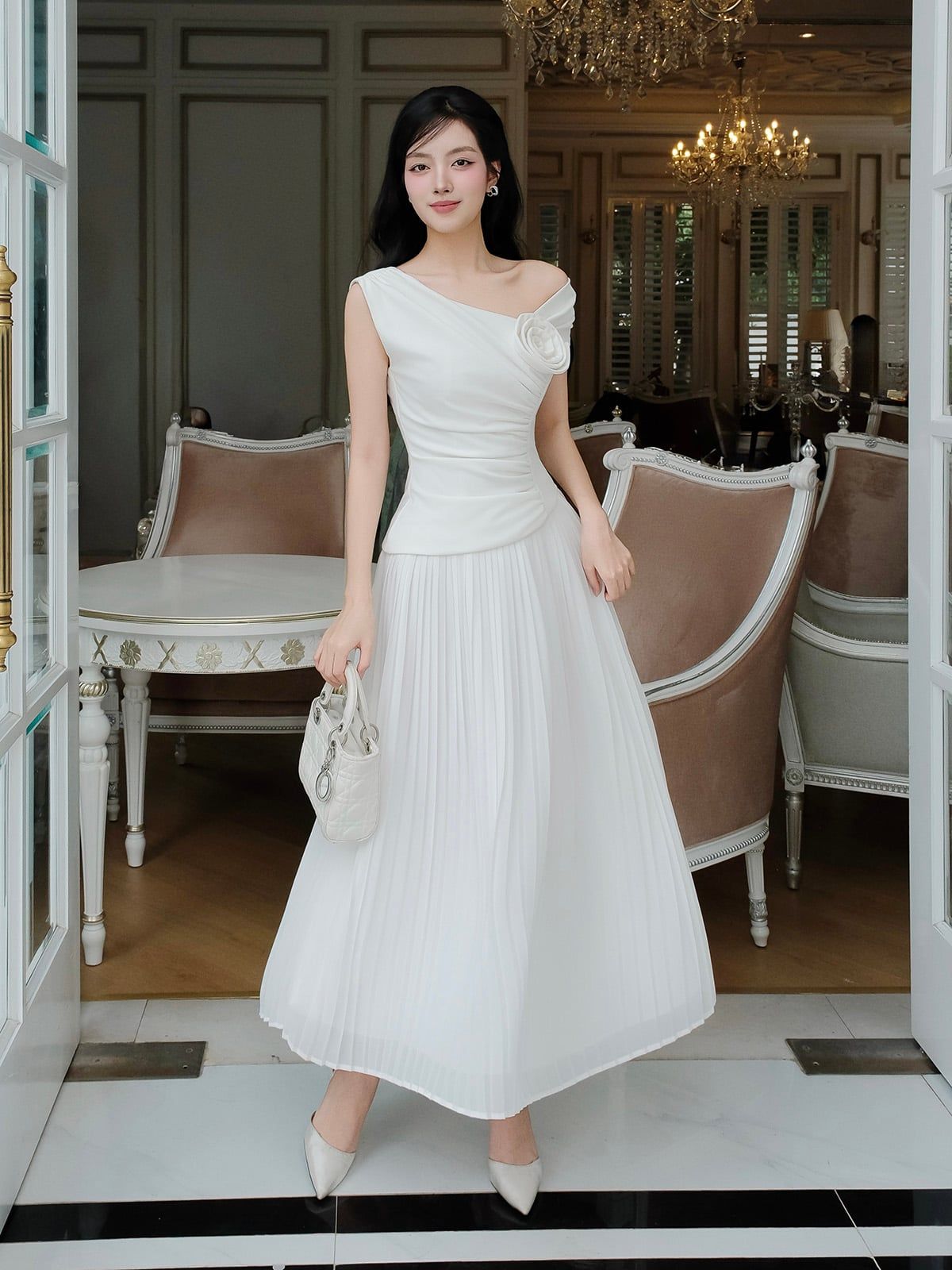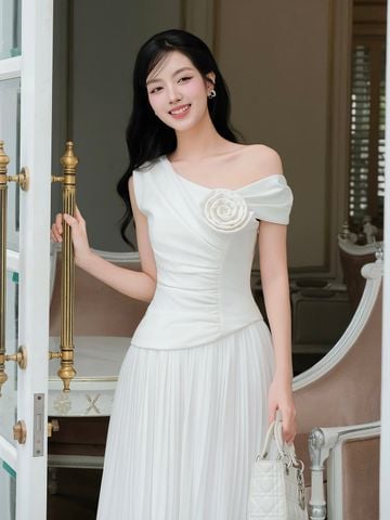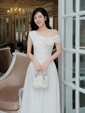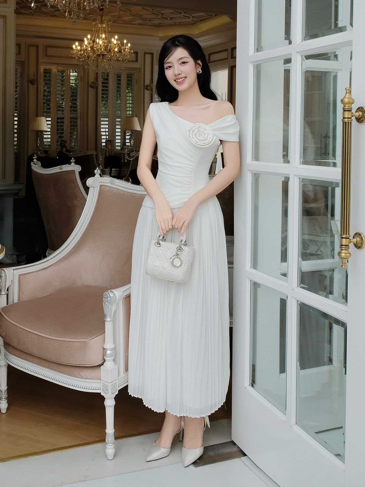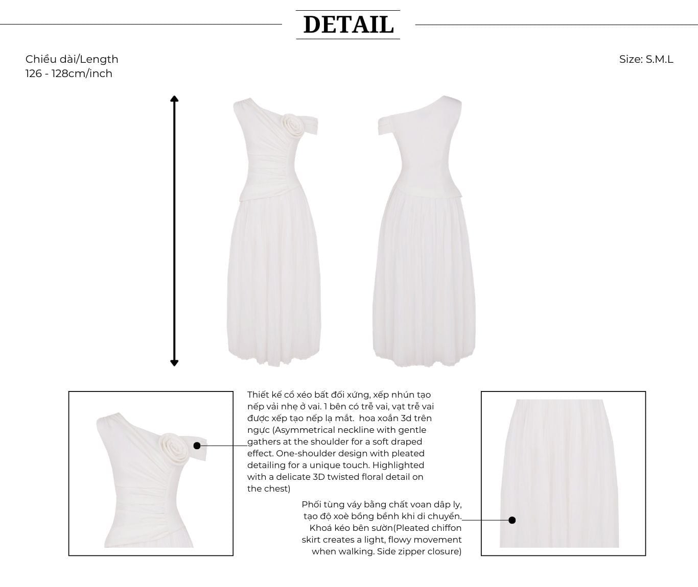 🔹 Form đầm midi với dáng đầm xòe nhẹ tạo hiệu ứng thon gọn ở eo và bồng bềnh ở tùng váy. Thiết kế cổ xéo bất đối xứng kết hợp chi tiết đầm trễ vai một bên giúp tôn lên bờ vai thanh mảnh. Phần vai được xếp nhún tạo nếp mềm mại, trong khi thân đầm rã lệch và nhún vải khéo léo giúp che bụng dưới tinh tế. Điểm nhấn đặc sắc nằm ở hoa xoắn 3D trên ngực, tạo hiệu ứng sang trọng và khác biệt. Sản phẩm có hai phiên bản đầm đen và đầm trắng, dễ lựa chọn theo phong cách cá nhân.