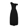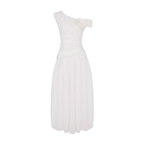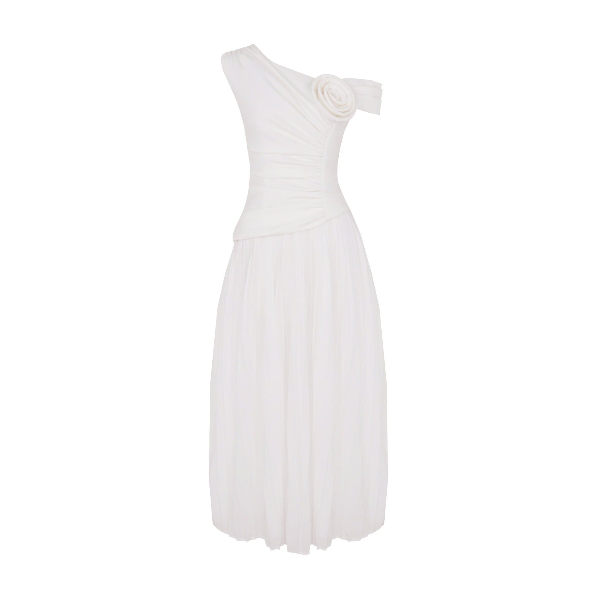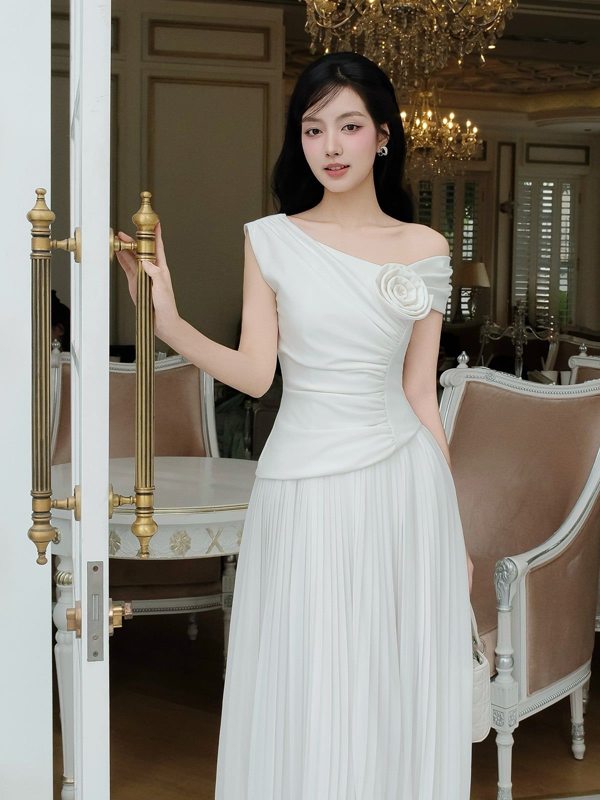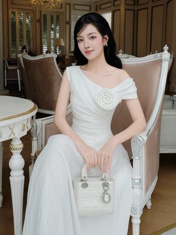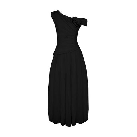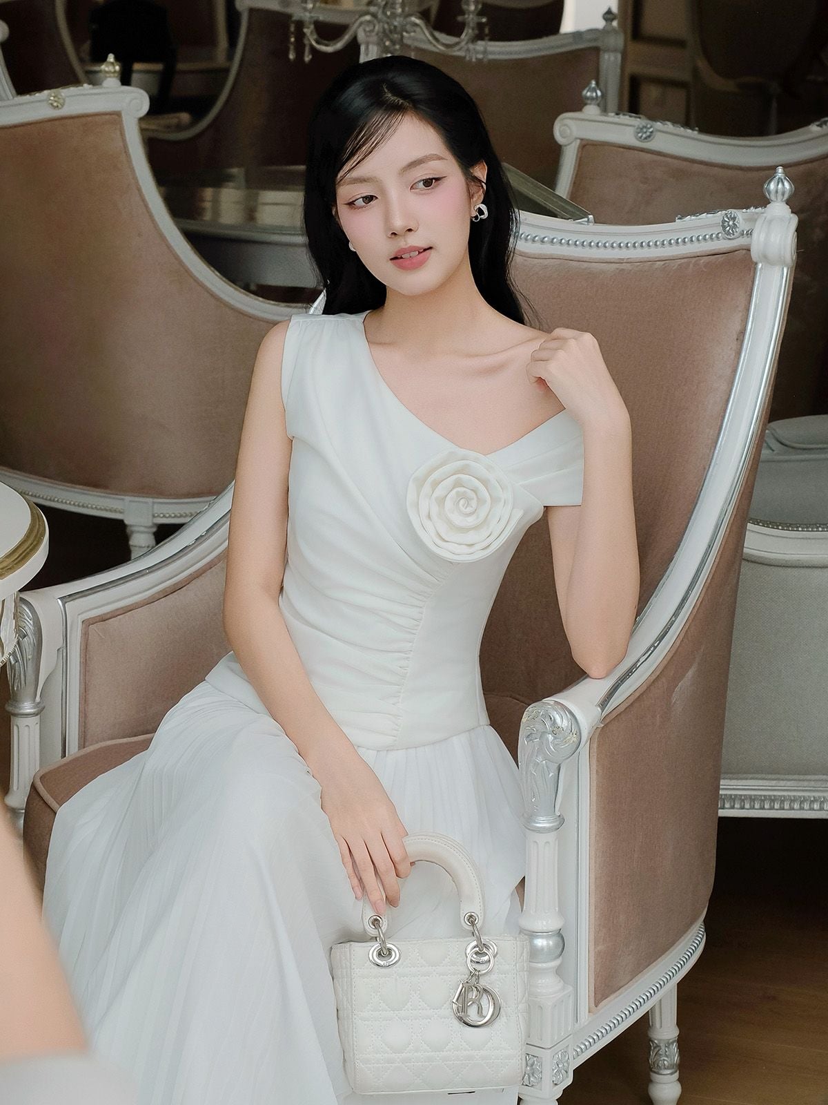 🔹 Form đầm midi với dáng đầm xòe nhẹ tạo hiệu ứng thon gọn ở eo và bồng bềnh ở tùng váy. Thiết kế cổ xéo bất đối xứng kết hợp chi tiết đầm trễ vai một bên giúp tôn lên bờ vai thanh mảnh. Phần vai được xếp nhún tạo nếp mềm mại, trong khi thân đầm rã lệch và nhún vải khéo léo giúp che bụng dưới tinh tế. Điểm nhấn đặc sắc nằm ở hoa xoắn 3D trên ngực, tạo hiệu ứng sang trọng và khác biệt. Sản phẩm có hai phiên bản đầm đen và đầm trắng, dễ lựa chọn theo phong cách cá nhân.