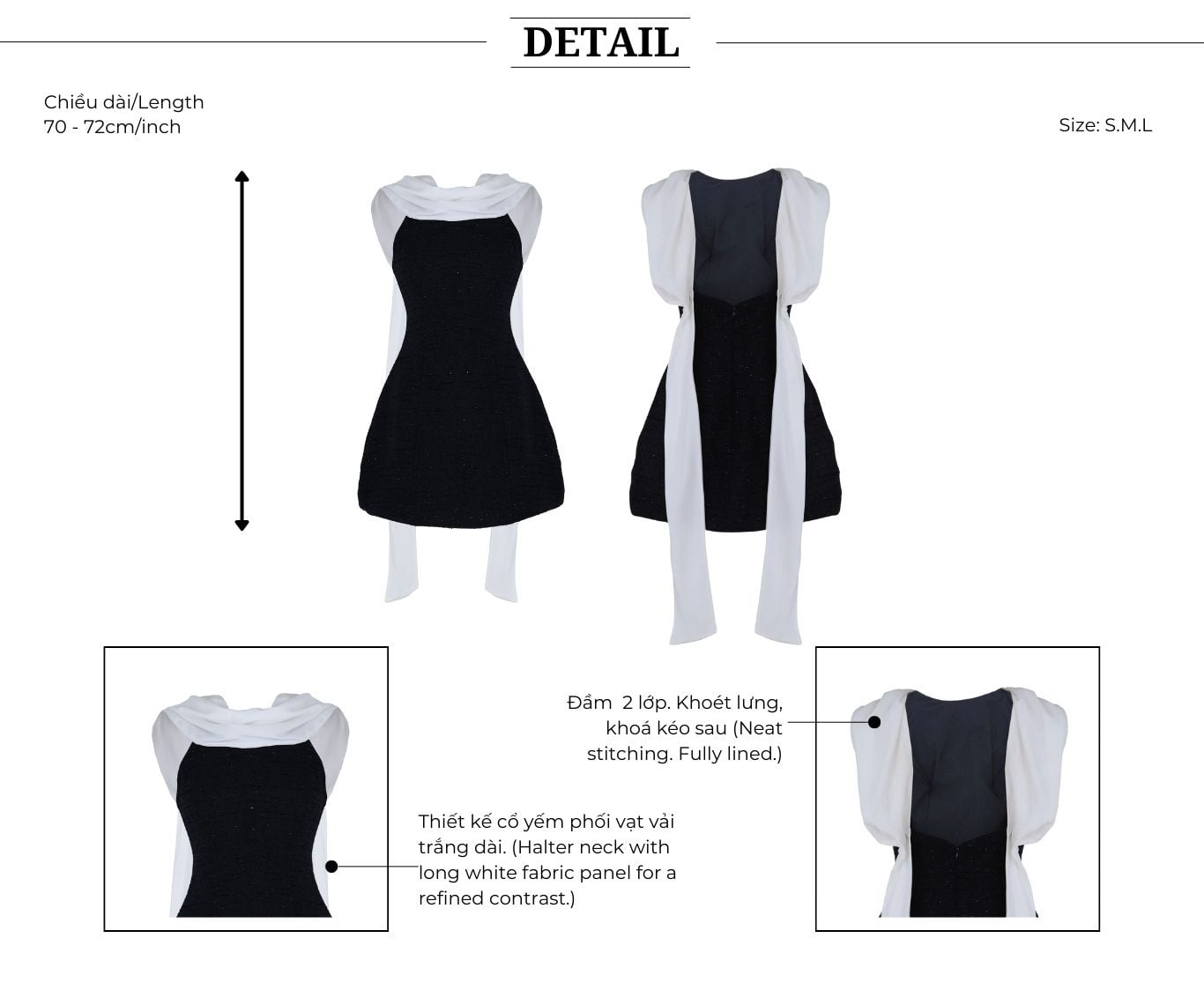 🔹 Phom đầm ngắn trên gối với dáng đầm A tạo độ đầm xòe nhẹ nhàng, giúp đôi chân trông thanh thoát và tổng thể trông cân đối hơn. Điểm nhấn đầm cổ yếm phối vạt vải trắng dài tạo hiệu ứng tương phản cuốn hút, đồng thời làm phần cổ – vai trông mềm mại và cao ráo. Thân váy tối giản giúp nàng dễ ứng dụng, còn khóa kéo giữa lưng giúp việc mặc vào gọn gàng và giữ phom đẹp. Đây là kiểu đầm tiệc đúng chuẩn “mặc lên là có thần thái”, phù hợp khi nàng cần một chiếc đầm đi tiệc hoặc đầm dự tiệc vừa sang vừa dễ diện.