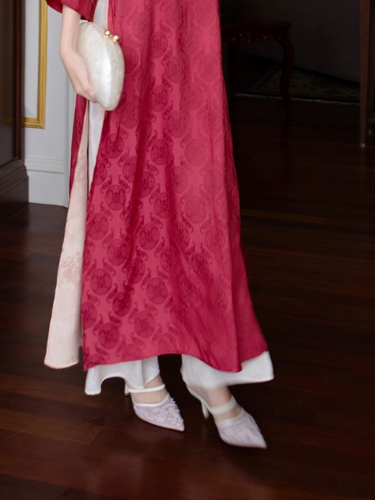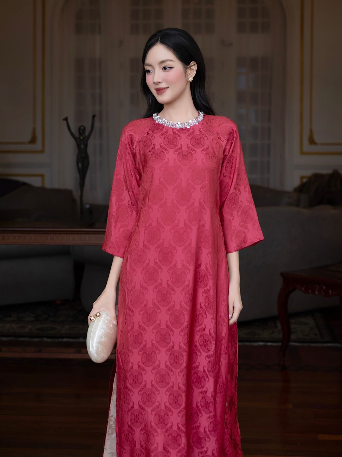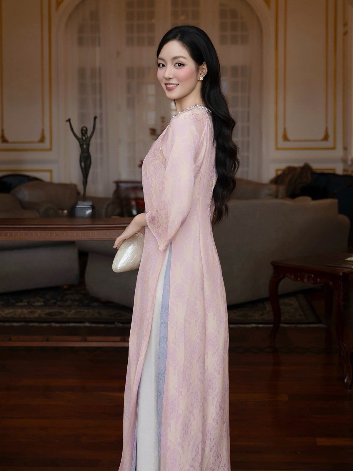 🔹 Nàng có thể diện set áo dài này khi dự tiệc, chụp hình hoặc trong những dịp lễ đặc biệt. Khi phối cùng giày cao gót mũi nhọn và túi cầm tay nhỏ, nàng sẽ có vẻ ngoài thanh lịch; hoặc chọn hoa tai ngọc trai để tăng thêm nét dịu dàng.