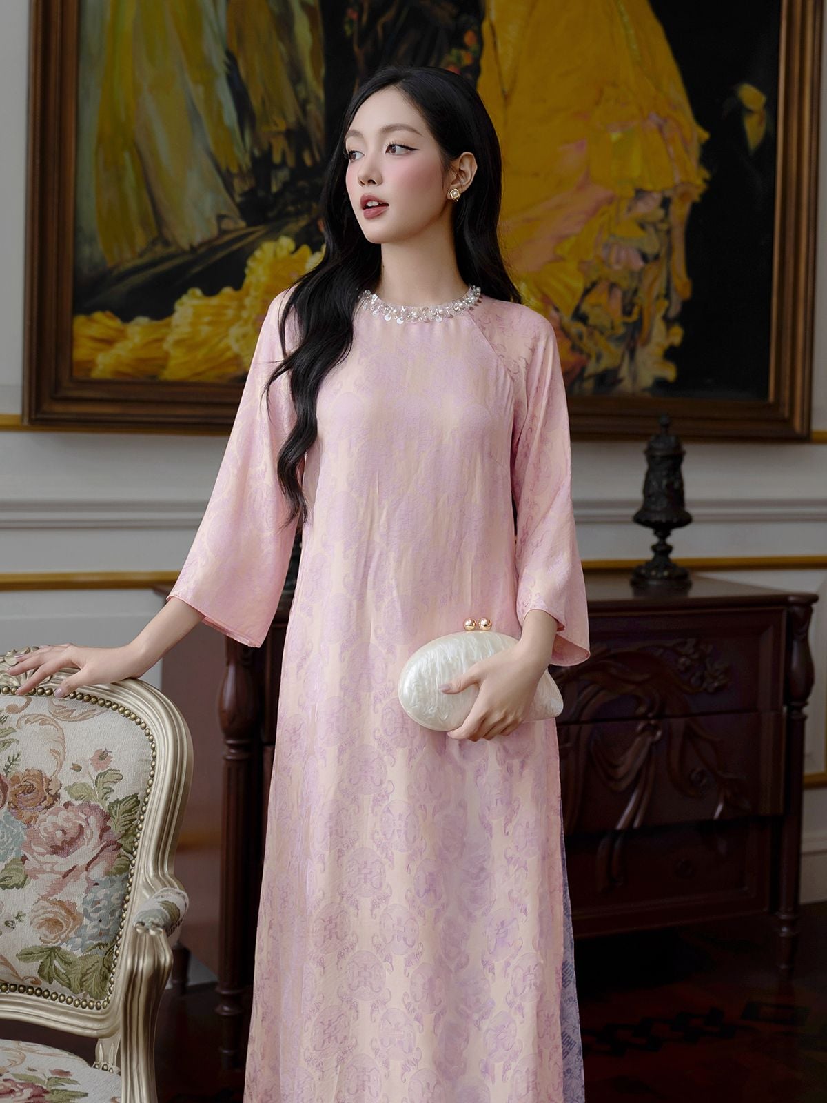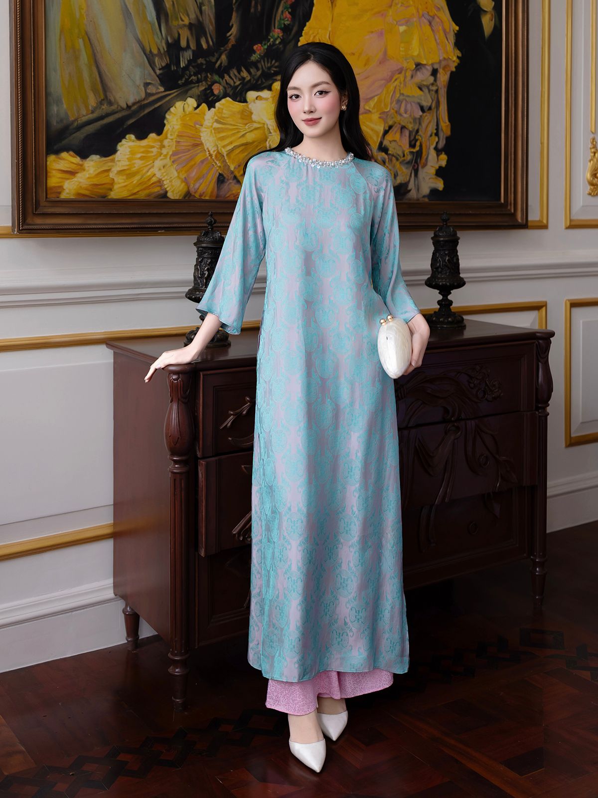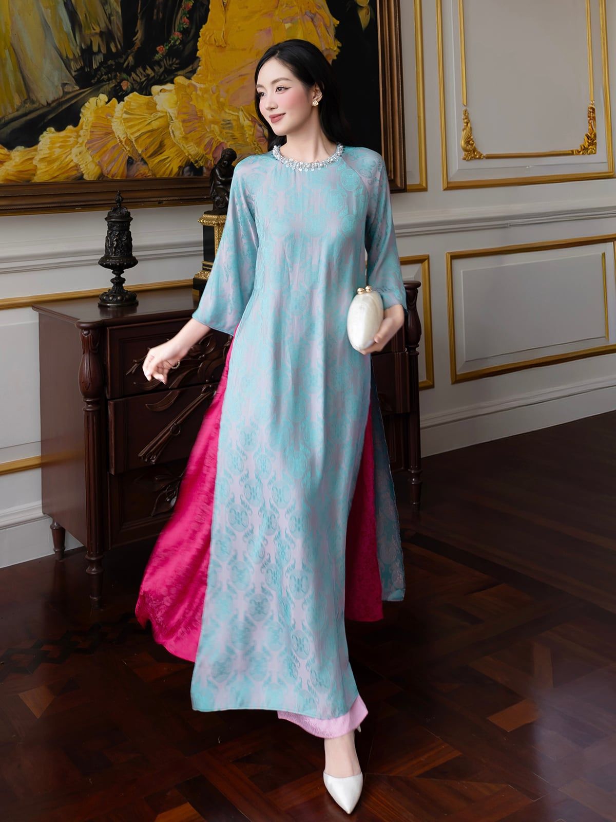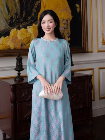 🔹 Set áo dài sở hữu form áo dài suông nhẹ, tay lửng mềm mại cùng cổ tròn không chân bâu, giúp tổng thể trông thanh thoát và nữ tính hơn. Điểm nhấn tinh xảo nhất nằm ở viền cổ kết dãy kim sa và ngọc trai, bắt sáng nhẹ nhàng, tạo hiệu ứng nổi bật nhưng không phô trương. Thiết kế 4 tà được xử lý hài hòa giữa gấm 2 da cao cấp ở tà ngoài và lớp lụa gấm hoa ở tà trong, tạo chuyển động uyển chuyển theo từng bước chân – một chi tiết rất được yêu thích trong các từ khóa phụ như áo dài dự tiệc, áo dài sang trọng.